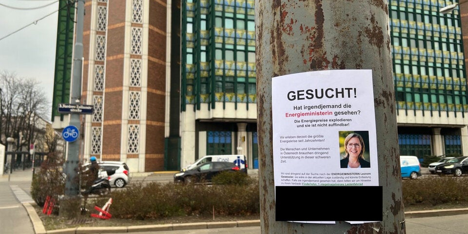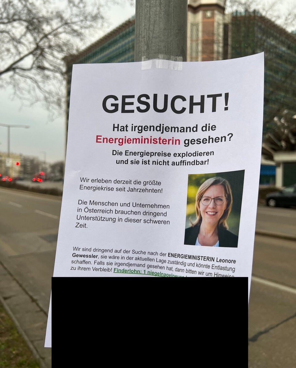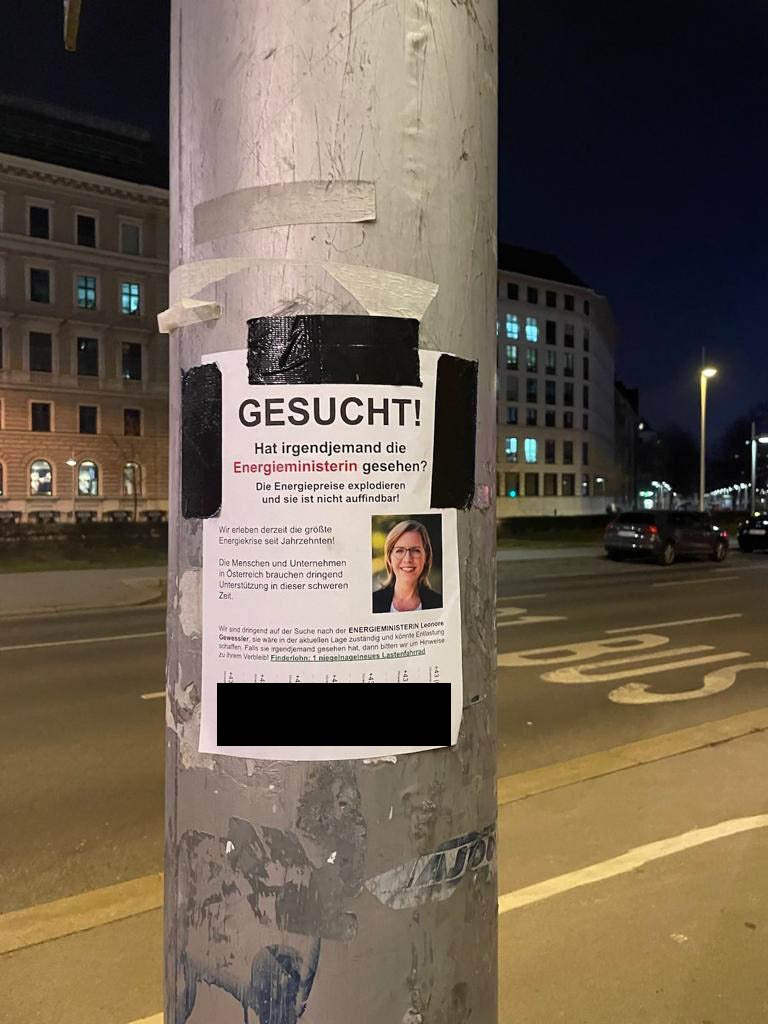 Dem Urheber eines Gesucht-Flyers sind die Ankündigungen der Politik offenbar noch zu wenig. Der satirische Beitrag, der in Wien gesichtet wurde, sorgt bei Passanten derzeit für Lacher. "Gesucht! Hat irgendjemand die Energieministerin gesehen? Die Energiepreise explodieren und sie ist nicht auffindbar! Wir erleben derzeit die größte Energiekrise seit Jahrzehnten! Die Menschen und Unternehmen in Österreich brauchen dringend Unterstützung in dieser schweren Zeit", steht auf dem Aushang.