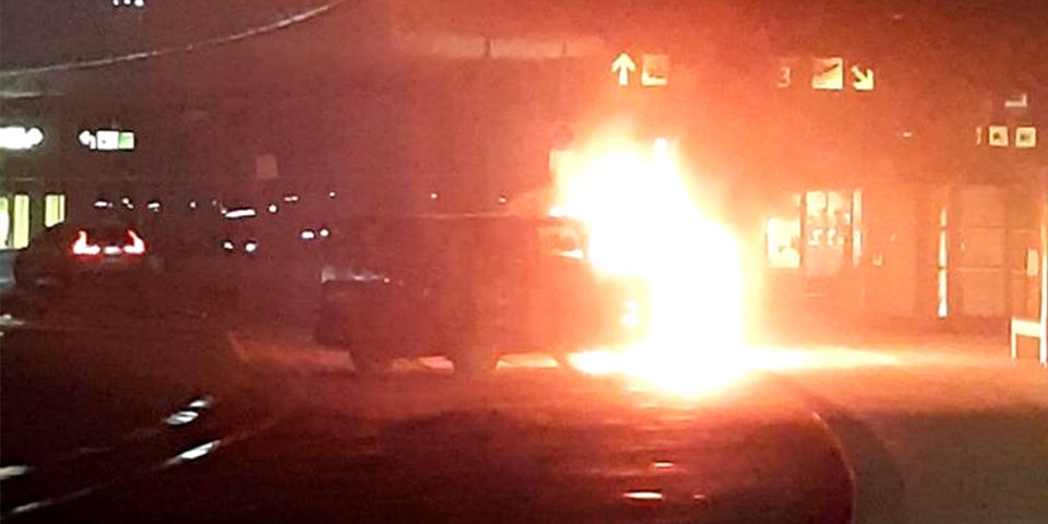 Ein schwarzer Mercedes Vito hatte in der Nähe der Abflughalle aus bisher unbekannter Ursache Feuer gefangen und stand innerhalb kürzester Zeit in Vollbrand.