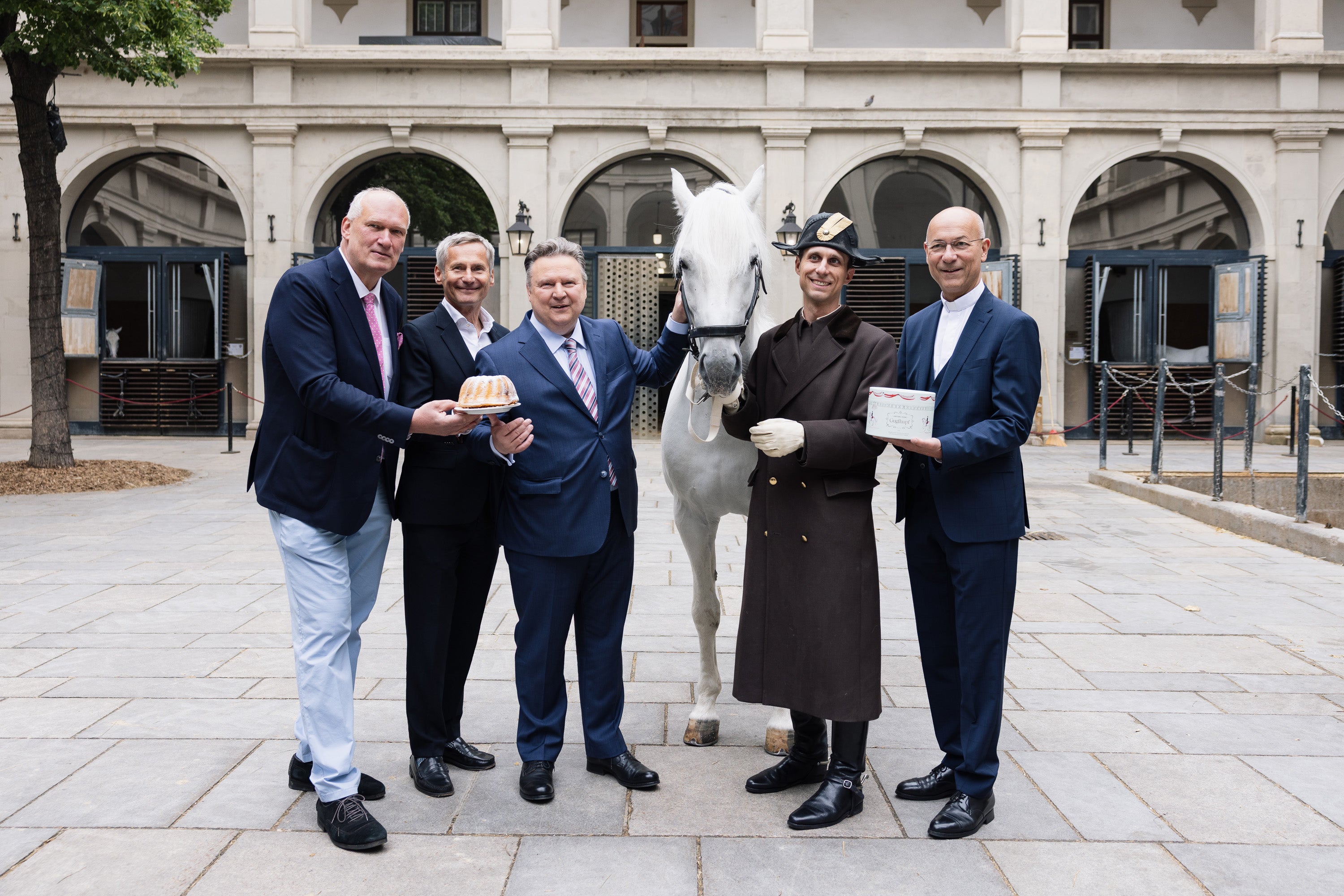 Zum Auftakt der Zusammenarbeit präsentiert das Café Landtmann seinen legendären Guglhupf in Verpackung einer limitierten Edition – gewidmet der 460-jährigen Geschichte der Spanischen Hofreitschule. Zur Präsentation in der Spanischen Hofreitschule kamen Bürgermeister Michael Ludwig, Dompfarrer Toni Faber, Julius Meinl-Geschäftsführerin Christina Meinl sowie Gastgeber Alfred Hudler und Berndt Querfeld, die gemeinsam den Guglhupf anschnitten.
