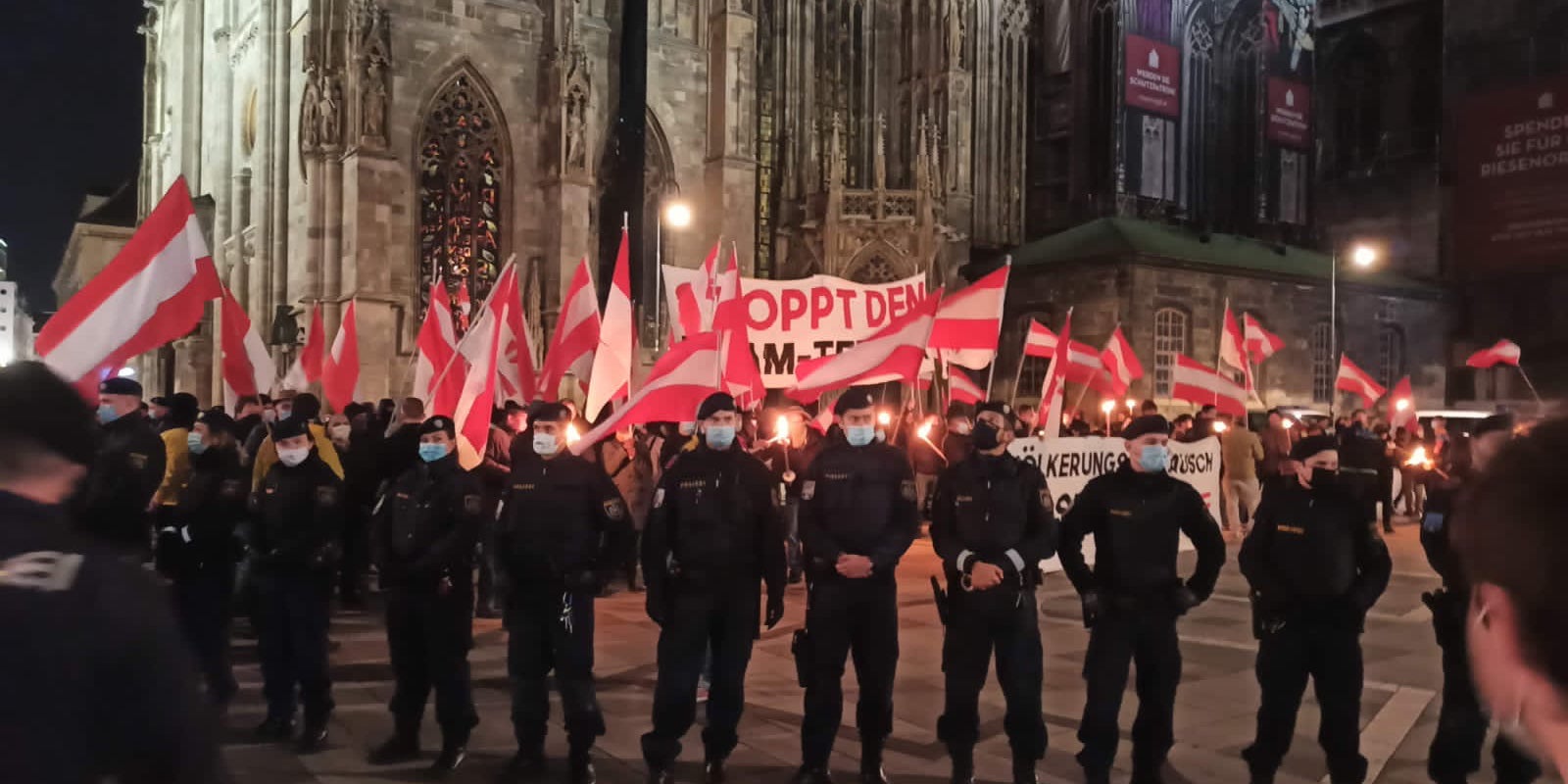 Drei Tage nach dem verheerenden Terror-Anschlag marschierten die rechtsextremen Identitären vor dem Stephansdom auf. Einige Dutzend Teilnehmer versammelten sich mit Fackeln und Rot-Weiß-Roten-Fahnen vor dem Dom und zogen später weiter durch die Innenstadt. Sie hielten Transparente hoch, auf denen "Stoppt den Islam-Terror" und "Bevölkerungsaustausch stoppen" stand.