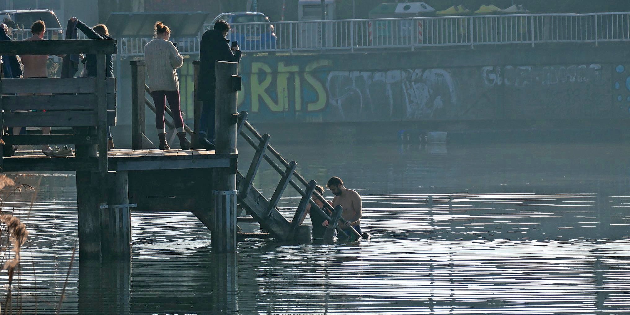 Laut Daten der ZAMG war es in Wien auch nicht gerade frostig: Gegen 15 Uhr wurden an der Messstelle Stammersdorf 10,6 Grad gemessen. Und da kam Wadsaks zweites Posting gerade recht: An der Alten Donau gingen die Neujahrsschwimmer ins gar nicht so kühle Nass.