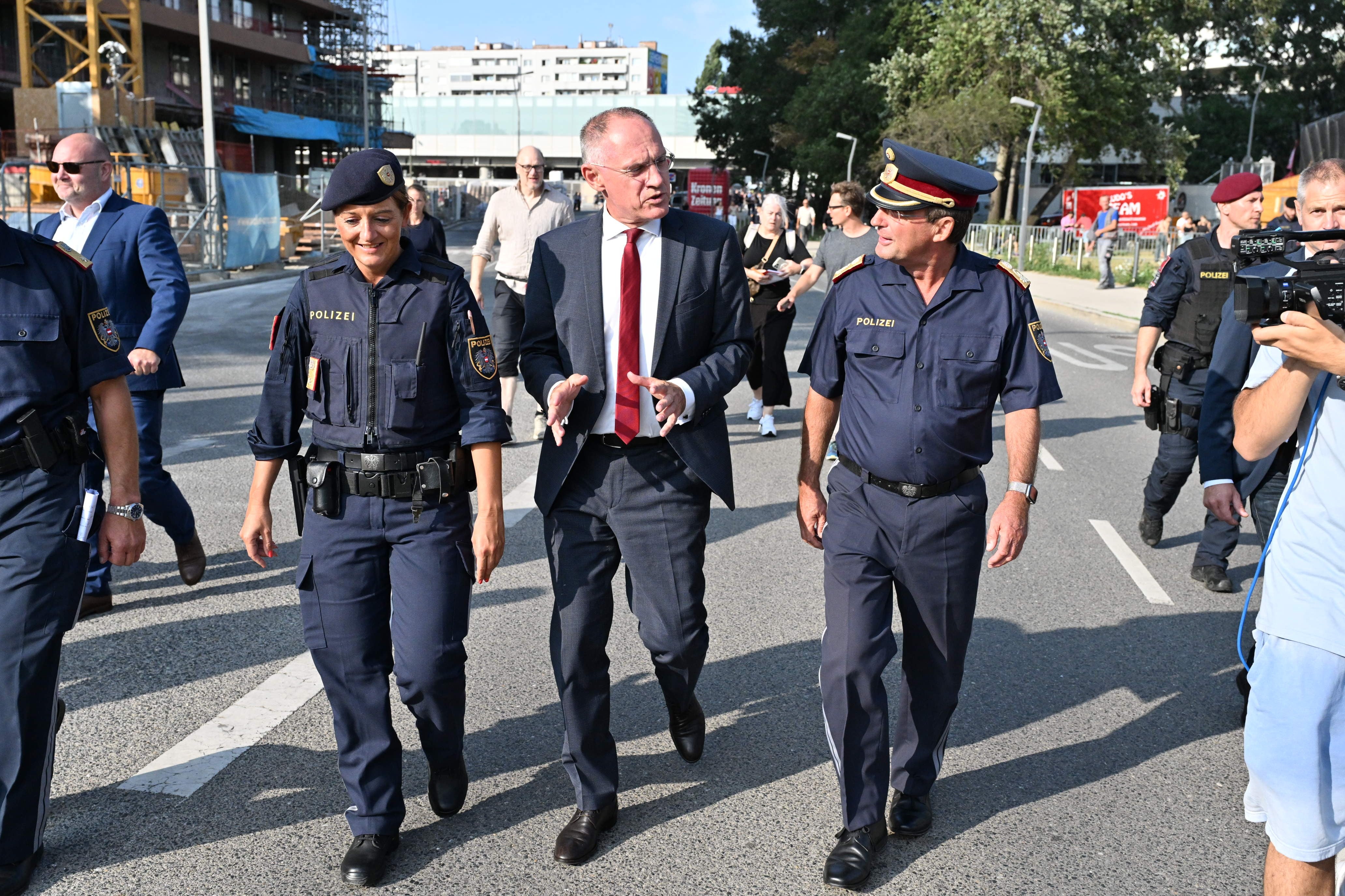 Innenminister Gerhard Karner besuchte vor dem Coldplay-Konzert im Happel-Stadion die Einsatzkräfte um sich ein Bild von der Sicherheitslage zu machen.