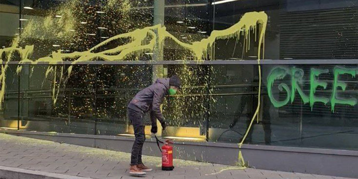 Aktivisten der Umweltorganisation ''Extinction Rebellion'' haben am Montagnachmittag den Eingangsbereich der Wirtschaftskammer Österreich (WKO) in Wien-Wieden mit grüner Farbe bemalt.