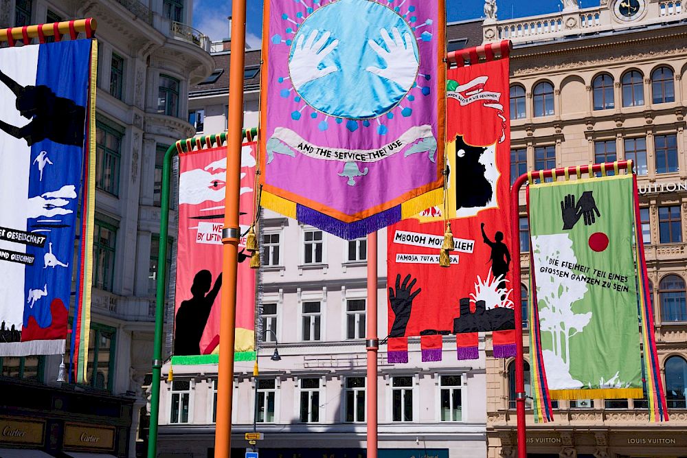 Wie schon in den Jahren zuvor wird die Flaniermeile am Wiener Graben heuer erneut zur öffentlichen Freiluft-Kunstgalerie. Ab heute stellt dort nämlich die italienische Künstlerin Marinella Senatore ihre Installation "I Contain Multitudes" (Ich enthalte Vielheiten) vor. Die Ausstellungsgalerie besteht aus bunten Fahnenmasten, die mit auffälligen Bannern geschmückt sind. Die Ausstellung ist Teil der Reihe "Kunst im öffentlichen Raum Wien" (KÖR), die seit über 15 Jahren immer wieder markante Kunstwerke präsentiert.