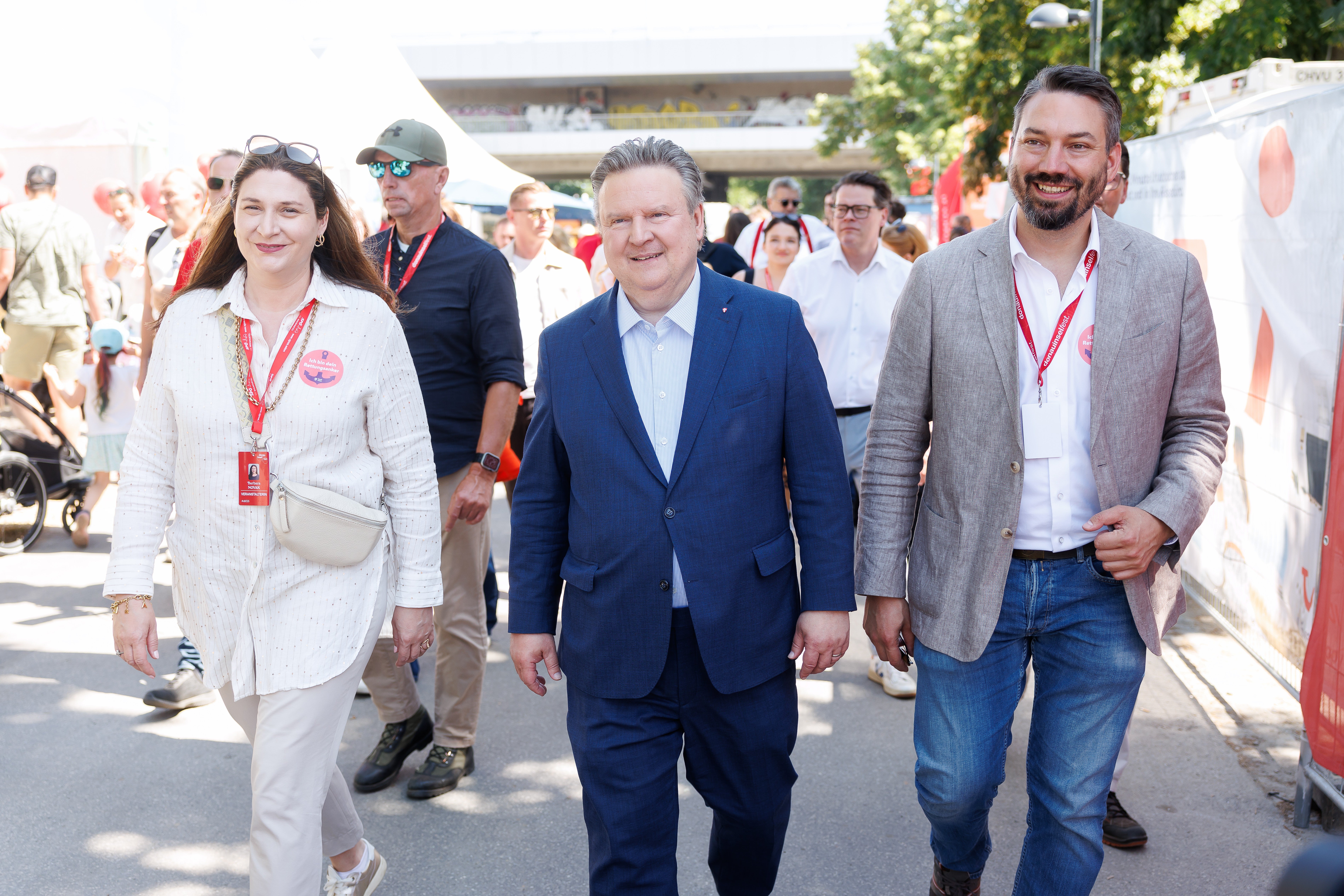 Bürgermeister Michael Ludwig (SPÖ) posierte gemeinsam mit den sozialdemokratischen Mitgliedern der Stadtregierung vor zig Kameras und Handys. Und er begrüßte wie schon im Vorjahr den Bundesparteichef Andreas Babler als Gast. Eine gemeinsame Runde drehte das Duo allerdings diesmal nicht - man suchte sich getrennt seinen Weg über die Arbeitsinsel am unteren Ende des Festareals. Der Vizekanzler genehmigte sich bei der Berufsrettung Bier und Gulasch, der Rathauschef versuchte sich einstweilen im Ballwerfen beim Stand der Wiener Netze.