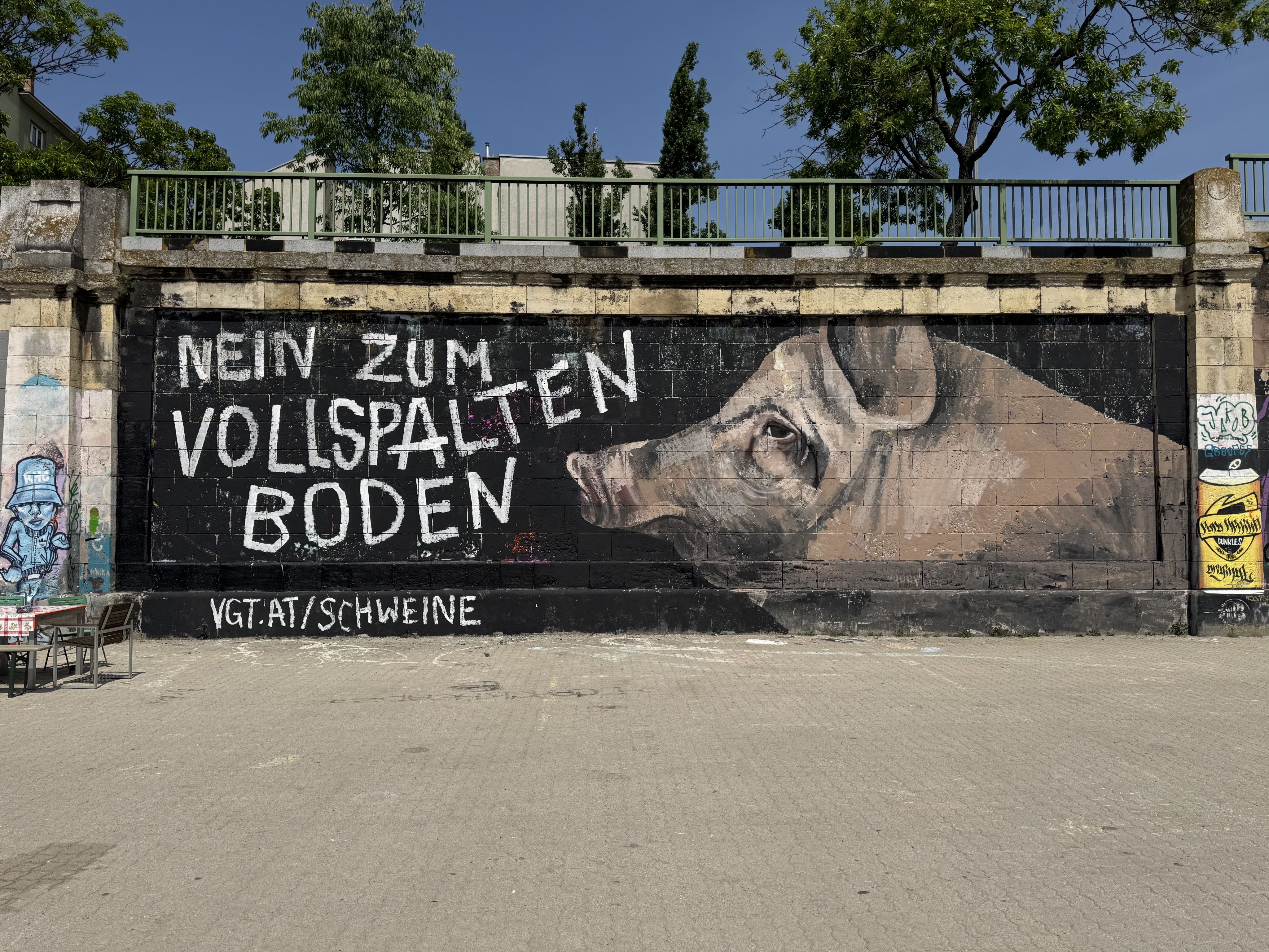 Am 9. Mai soll im Gesundheitsausschuss ein neues Gesetz zum Vollspaltenboden für Schweine beschlossen werden, das mit Anfang Juni in Kraft tritt. Kritik daran übt ein neues Wandgemälde am Wiener Donaukanal.