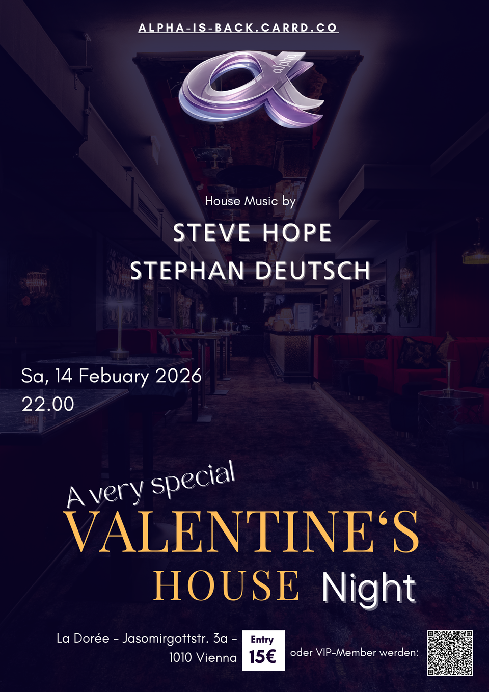 Musikalisch wird der Abend von House Music in klassischer Alpha-Manier begleitet. Die DJs Stephan Deutsch und Steve Hope sorgen an den Decks für den passenden Sound. Das Event richtet sich gezielt an ein erwachsenes Publikum, das Wert auf einen stilvollen Rahmen und eine energiegeladene Nacht legt.