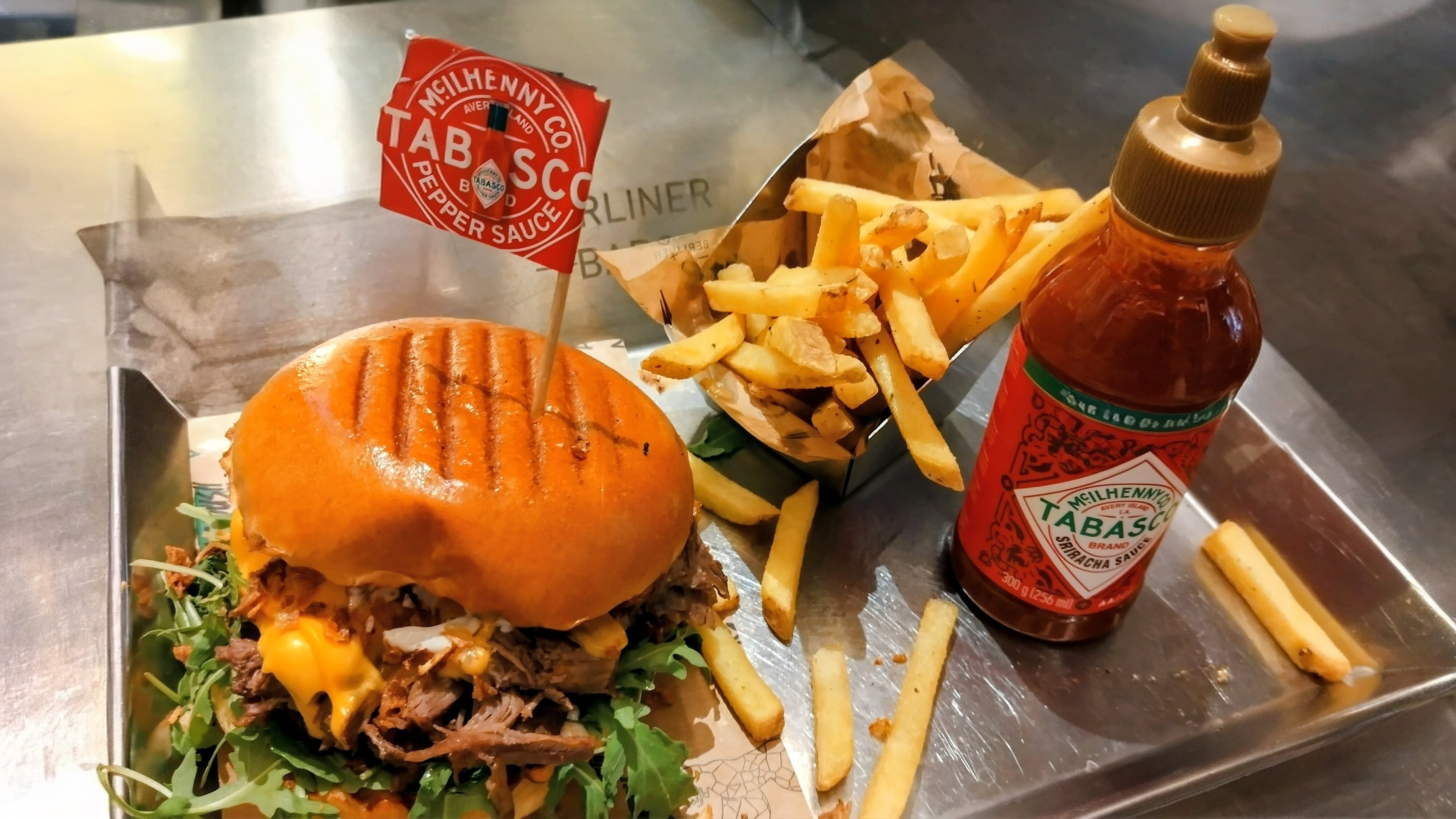 Pulled Beef, Rucola, hausgemachte Knoblauchsauce, knusprige Zwiebeln und doppelt Cheddar. Abgeschmeckt mit TABASCO® Sriracha Sauce. Saftig, würzig – mit genau der richtigen Portion Schärfe.