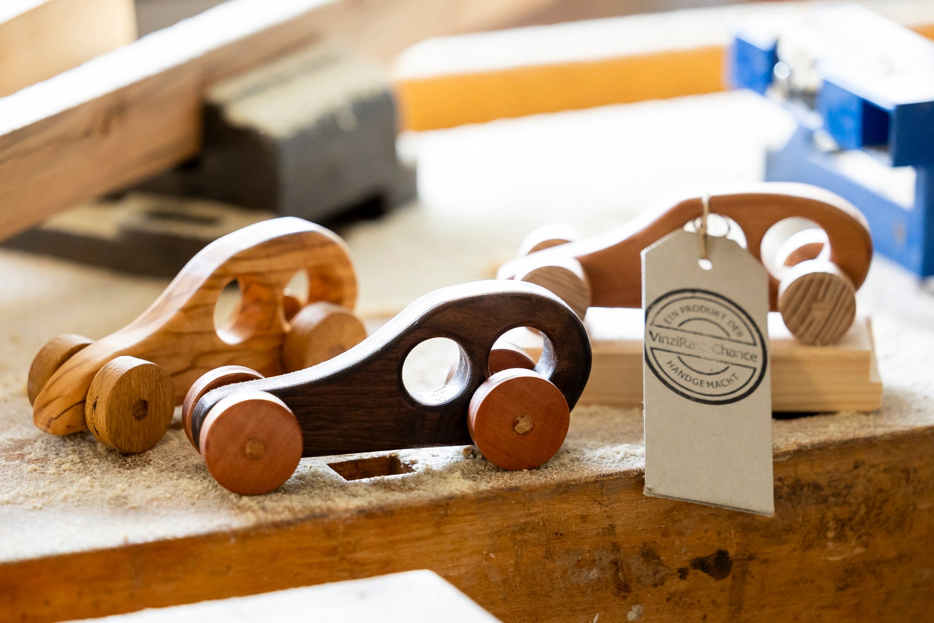 Jedes Stück, das in den Werkräumen der VinziRast-Chance entsteht, ist ein handgefertigtes Unikat: Erhältlich sind verschiedene Taschen, Tabletts, Schürzen, Schmuck, Holz-Spielzeug, Oster-Deko, Schemel uvm.