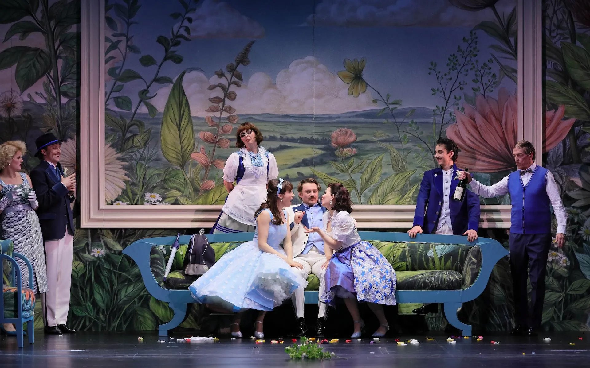 Die Heimatfilm-Assoziation weckt bereits ein Vorspann mit Titel und Besetzungsangaben in alter Schrift, der über den Vorhang "flimmert", während das Orchester die wohlbekannte Ouvertüre intoniert. Das Bühnenbild gefällt und ist so farbenprächtig wie die Kostüme, beides mit 50er-Flair und etwas Österreich-Charme (inklusive Wegweiser nach St. Pölten und einem alten SPÖ-Plakat). Die Geschichte mit all ihren Frivolitäten und Verwechslungen braucht keinen Tiefgang, in Zeiten wie diesen kann man rund zwei Stunden auch gerne mal nur unterhalten werden.