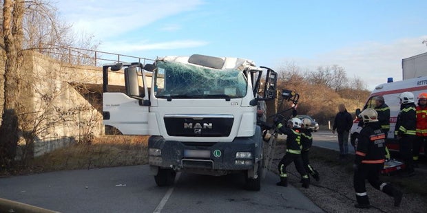 Ein Lkw-Fahrer rammte gestern Nachmittag eine ehemalige Bahnunterführung in der Breitenleer Straße in Wien-Donaustadt. Der Lkw blieb mit dem Ladekran am Brückenbauwerk hängen und hob das gesamte Fahrzeug unter der Brücke hoch. Die Fahrerkabine knallte gegen die Unterführung und riss bei der Ausfahrt einen hölzernen Lichtmast um. Nach dem spektakulären Unfall musste der Lenker verletzt ins Krankenhaus eingeliefert werden.