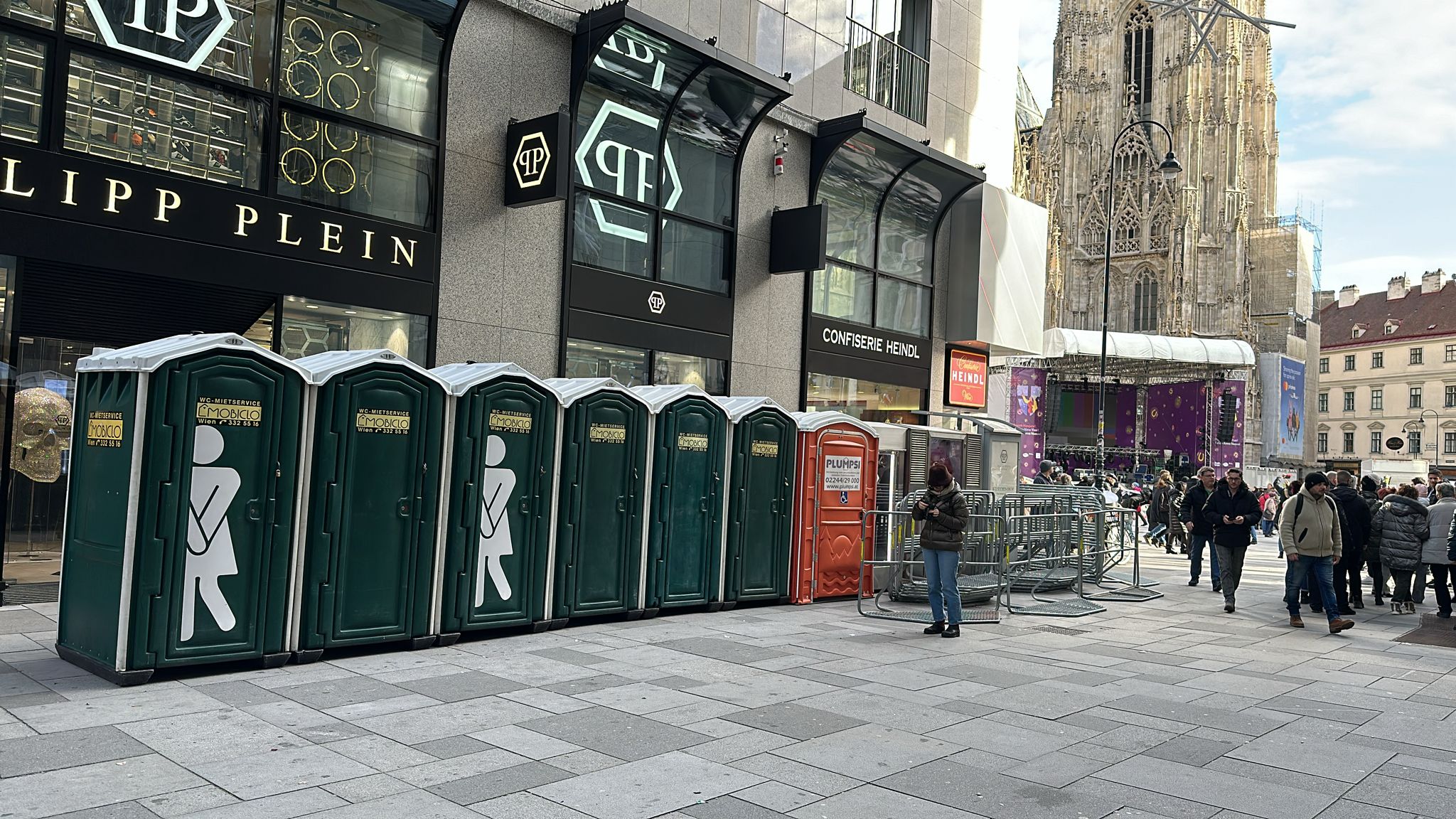 Bereits einen Tag vor dem Silvesterpfad stellten die Veranstalter eine Mobil-WC-Straße in der Wiener Goldschmiedgasse auf. Und zwar genau vor dem Philipp Plein Store von Manuela und Ernst Fischer.