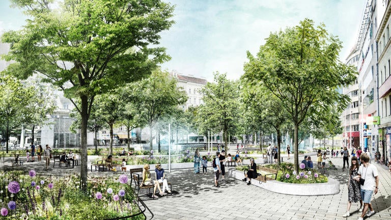 Mehr Fahrkomfort und Sicherheit auch für Radfahrende bringen breite, baulich getrennte Radwege an der Kreuzung des Gürtels. Insgesamt 1.300 Quadratmeter begrünte Flächen und 35 neue Bäume sollen unter anderem den Platz klimafitter machen. Auch zwei Lüftungsbauwerke werden mit Kletterpflanzen berankt.