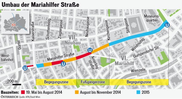 - Ab August bis 14. November folgen der zweite Teil der Begegnungszone ab der Zieglergasse und der zweite Teil der Fußgängerzone von der Neubaugasse bis zur Kirchengasse.