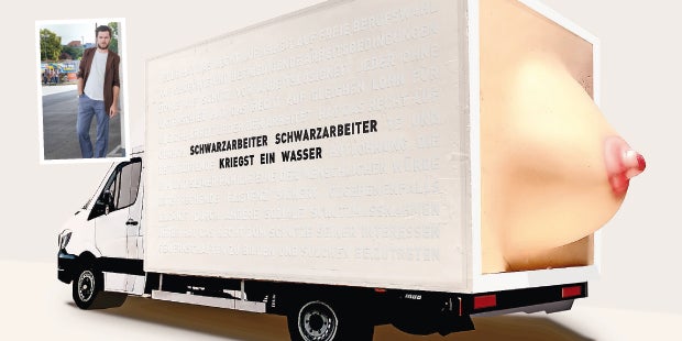 Jetzt will er von 23. bis 30. August mit einem sehr expliziten „Kommentar“ zur gnadenlosen Ausbeutung der Betroffenen Stellung beziehen. „Die Wiener Maria“ ist ein Kaltwasserbrunnen in Busenform, der an einem Kleinlaster befestigt ist und mit dem Spruch „Schwarzarbeiter, Schwarzarbeiter, kriegst ein Wasser“ sowie Auszügen aus der Allgemeinen Erklärung der Menschenrechte von 1948 beschriftet ist.