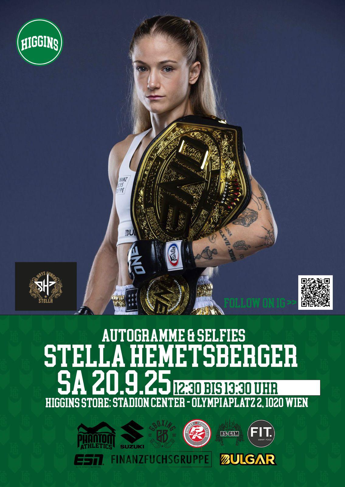 Sie ist Weltmeisterin im Muay-Thai und Vorbild mit Kampfgeist. Stella Hemetsberger verbindet Härte im Ring mit Herzlichkeit im Alltag. Jetzt lädt sie ihre Fans zu einem ganz besonderen Treffen in den Higgins Store im Stadion Center ein.