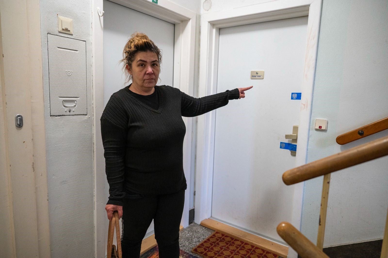 Klavdija J. (44), Verwaltungsassistentin steht geschockt vor der Wohnungstür. Eine Nachbarin im Haus soll gegen 7.30 Uhr ihren Sohn (4) erstochen haben. Die mutmaßliche Täterin - es gilt die Unschuldsvermutung - wurde bereits von der Polizei festgenommen.