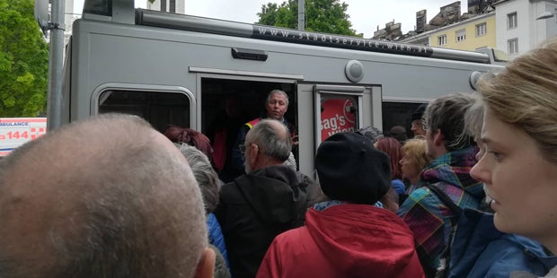Und weil der 3. und 4. Stock durch Wasserschaden nicht begehbar sind, wurden jetzt alle angewiesen, in die "Simm City" – das ist ein Veranstaltungsort samt Bühne im nahegelegenen Einkaufszentrum - zu gehen, um dort von Vertreter vom Bezirk, Hausverwaltung und dem Verein, der ein Spendenkonto ins Leben gerufen hat, sowie später auch Rathausleuten informiert zu werden, wie es jetzt weitergeht.