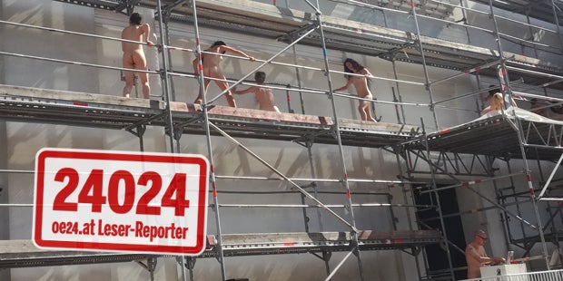 Das sieht man nicht alle Tage. Mitten in den Bauarbeiten an der Wiener Secession stehen plötzlich mehrere nackte Menschen auf dem Gerüst und tanzen, was das Zeug hält. Schon am Donnerstag lockte dieses Spektakel die Zuschauer an.