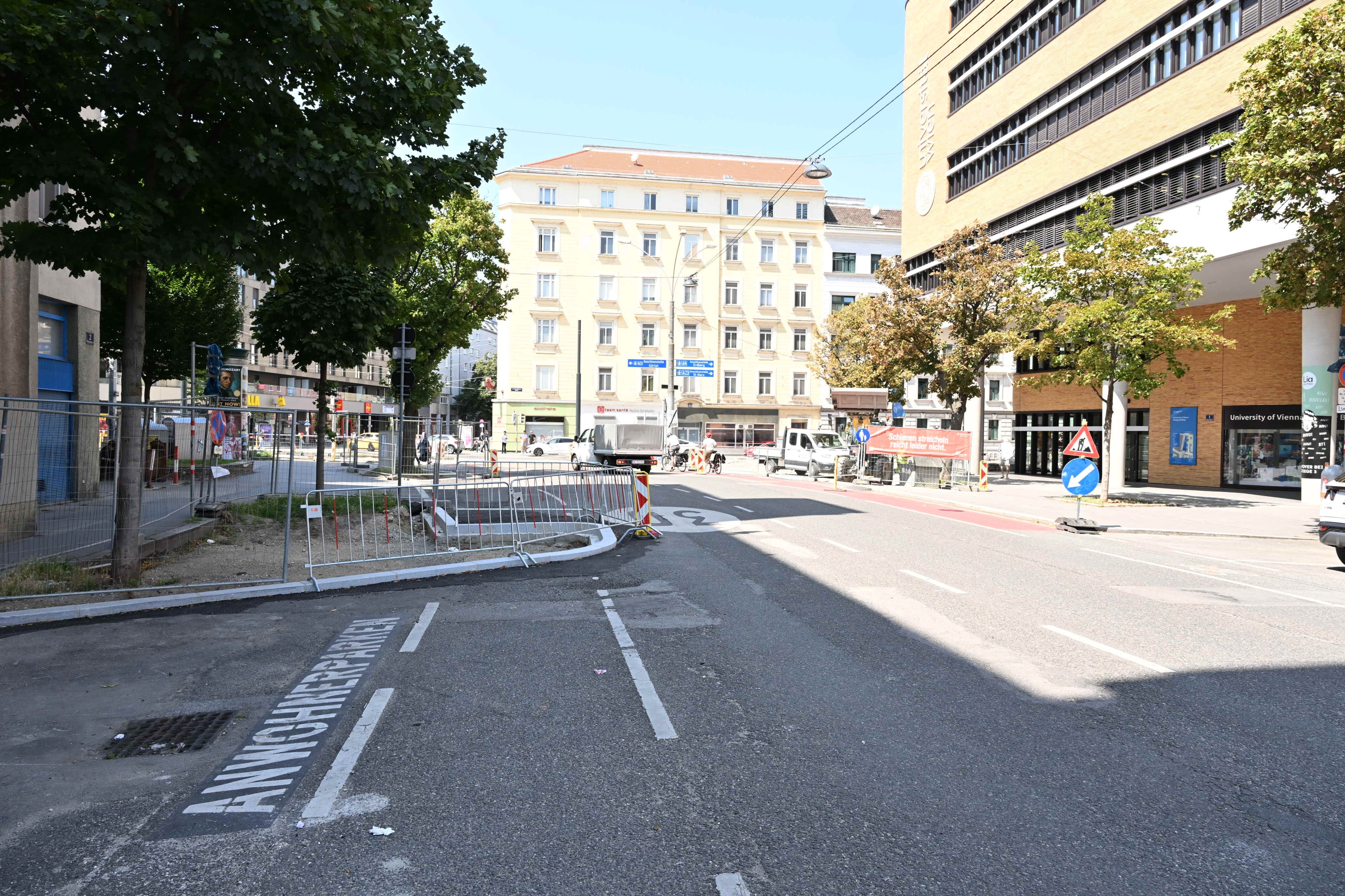 Wer mit dem Fahrrad von der Landstraßer Hauptstraße in die Viehmarktgasse unterwegs ist, erlebt derzeit eine böse Überraschung: Der Radweg endet abrupt in einer Baustelle. Neue Bordsteinkanten und ein frisch gepflanzter Baum versperren den Weg. Die Folge: Radfahrer müssen auf die Fahrbahn ausweichen und sich den Platz mit Autos teilen – eine gefährliche Situation.
