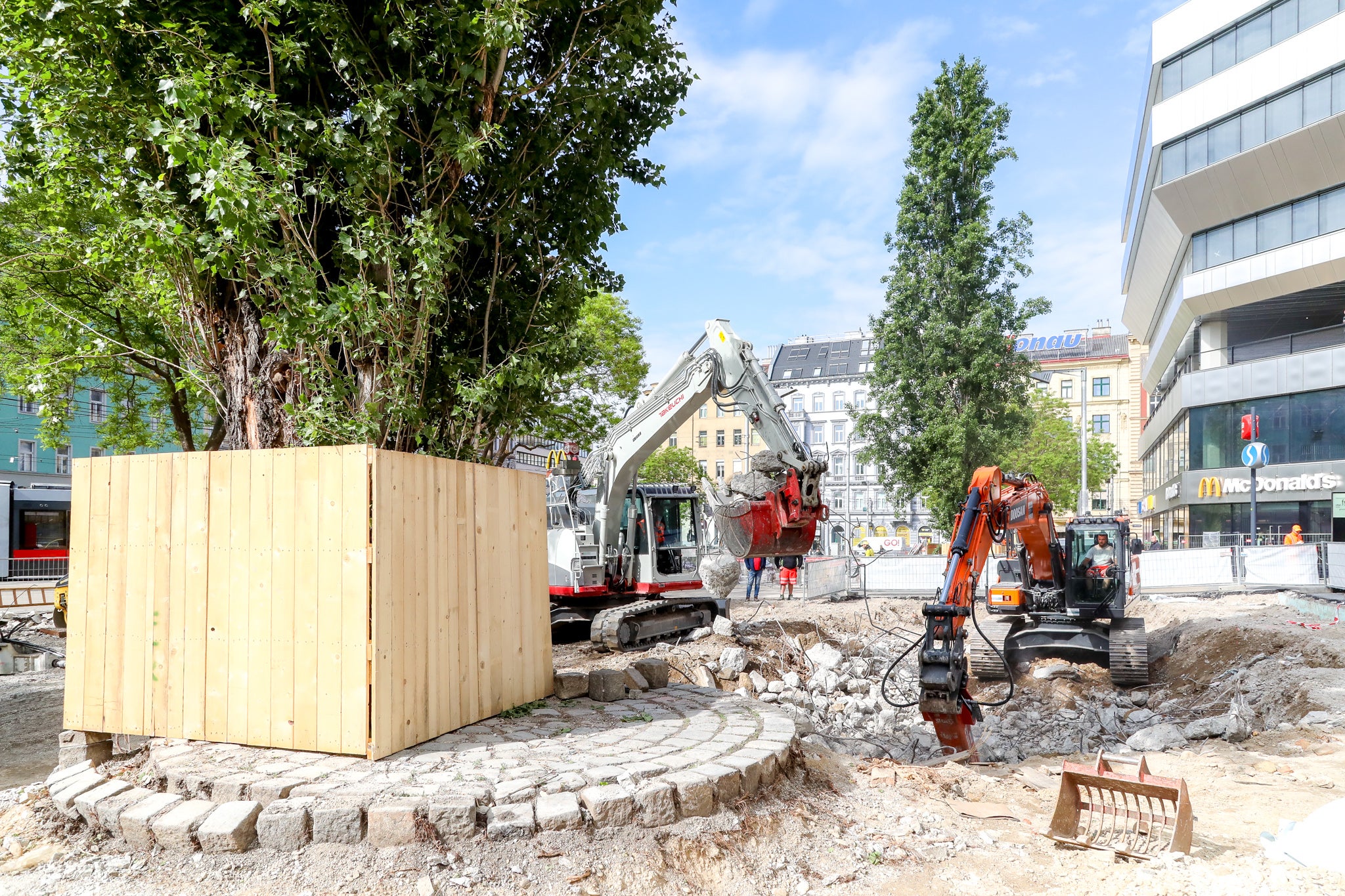 Der Vorplatz des Franz-Josefs-Bahnhofs ist Teil der wienweiten "Raus aus dem Asphalt"-Offensive. Die Neugestaltung inklusive Radwegeausbau schreitet dieser Tage kräftig voran.