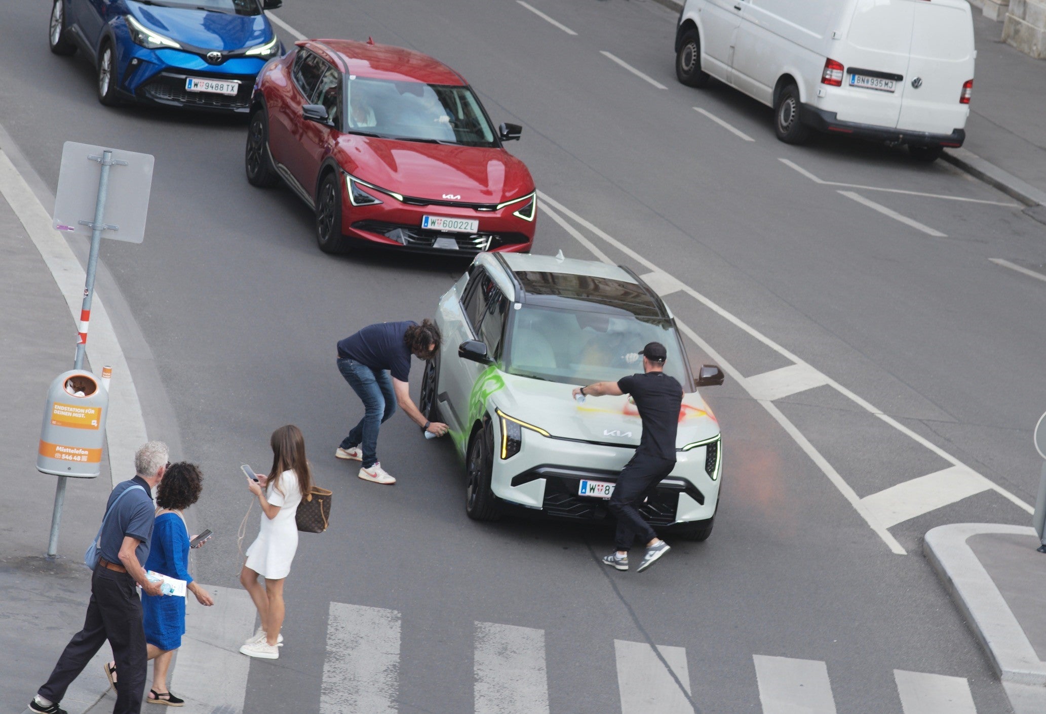 Vandalismus-Alarm in der Wiener Innenstadt: Zwei Unbekannte haben Donnerstagabend zur Rush Hour ein Auto hinter der Staatsoper mit Farbe besprüht. Der Wagen - vermutlich ein Kia EV3 - hielt gerade vor einem Zebrastreifen, als plötzlich die beiden Männer auf die Fahrbahn liefen und mit greller Sprühfarbe mehrere Muster auf die Karosserie sprayten. Der fassungslose Lenker ist nach wenigen Sekunden aus dem Auto gesprungen, um die Täter zu stellen, jedoch ohne Erfolg.