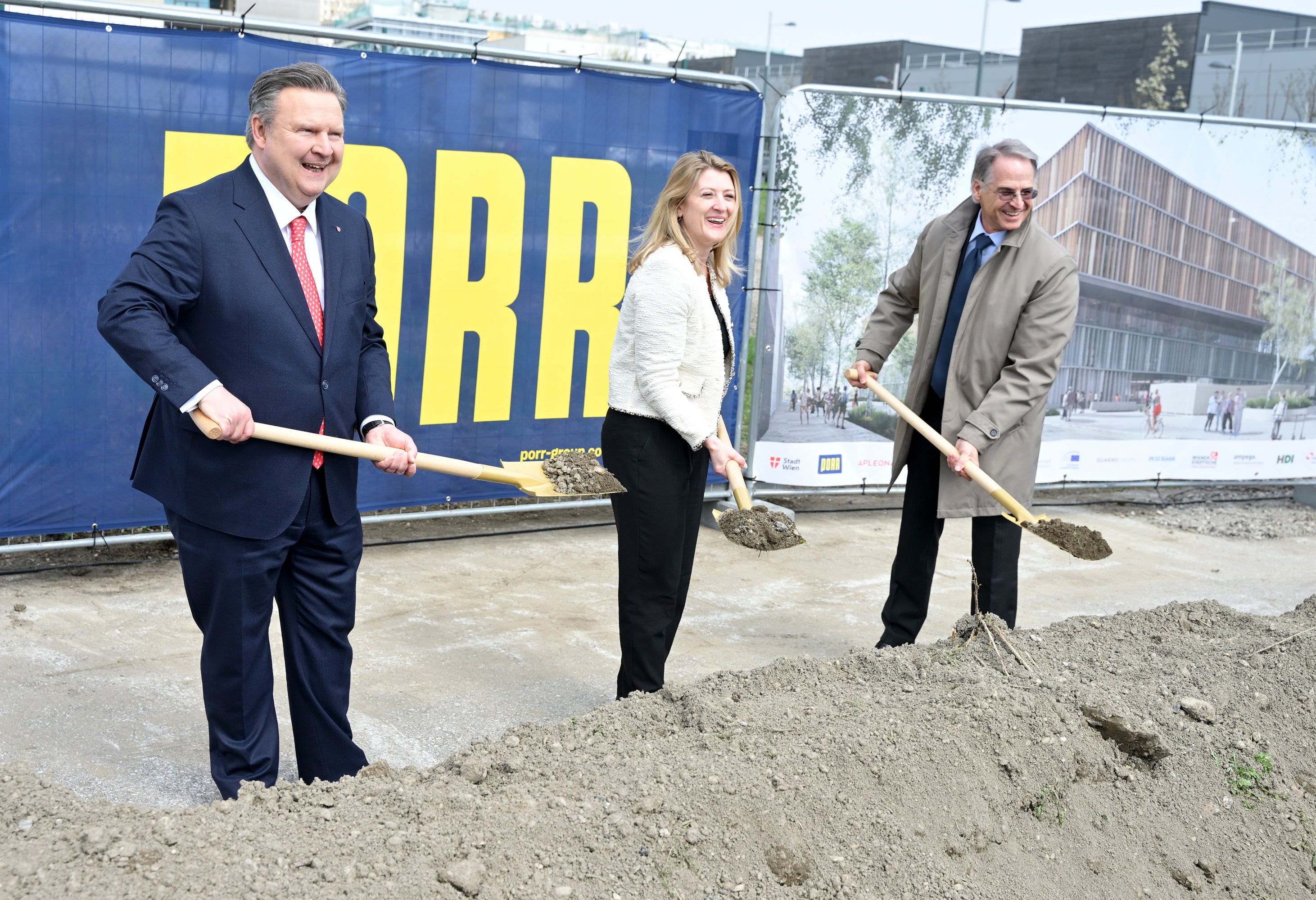 Bürgermeister Ludwig, Vizebürgermeisterin Emmerling und PORR CEO Karl-Heinz Strauss setzten am Mittwoch den Spatenstich in Aspern - und damit ein Zeichen für den hohen Stellenwert der Bildung in Wien.