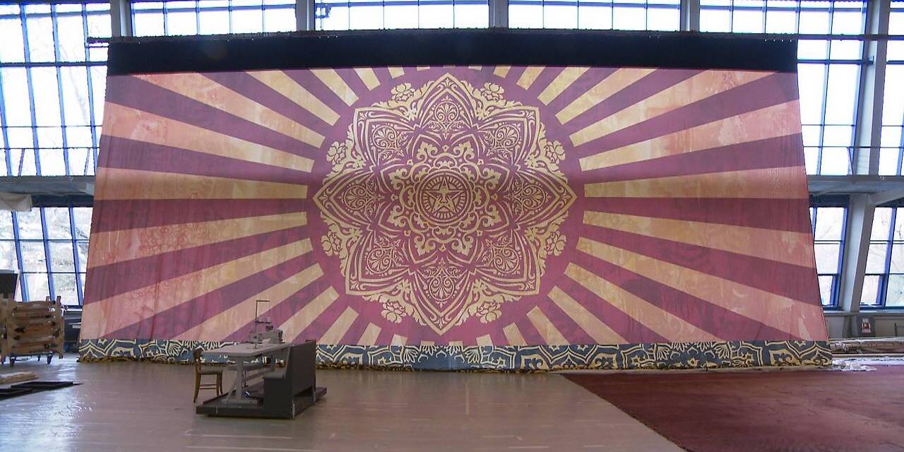 Ein 18 Meter breites und neun Meter hohes Kunstwerk liegt im Arsenal bereit für seinen großen Auftritt. Der US-amerikanische Street-Art-Künstler Shepard Fairey hat das Bühnenbild für die Ballettpremiere "Visionary Dances" am 28. März in der Wiener Staatsoper entworfen. Urban Art trifft damit auf klassisches Ballett.