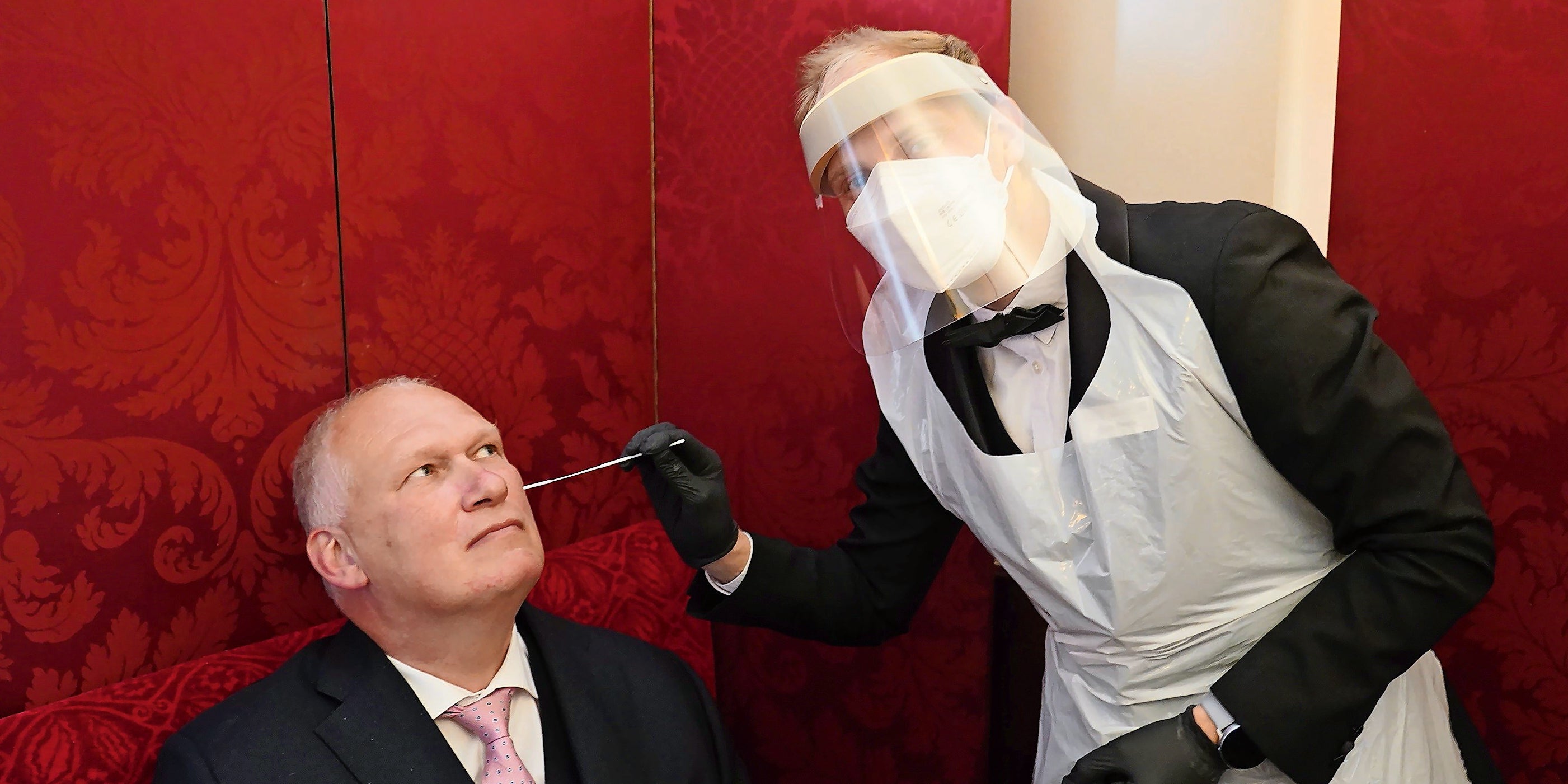Die Registrierung erfolgt so problemlos wie mittlerweile überall in Wien mit der E-Card. Dann wird’s spannend: Ober Patrick, ein ausgebildeter Sanitäter, kommt. Stilgerecht im schwarzen Anzug mit Fliege, darüber das bekannte Corona-Outfit mit Masken, Schürze und schwarzen Handschuhen. Zur Belohnung gibt’s nach dem Nasenbohren eine Melange und eine herrliche Erdbeerschnitte im Take-away – ein Schild weist darauf hin, dass Kaffee und Mehlspeisen nicht vor dem Lokal konsumiert werden dürfen. Es schmeckt auch weiter weg noch gut. Das Ergebnis-SMS kommt binnen zehn Minuten – der Test ist negativ …