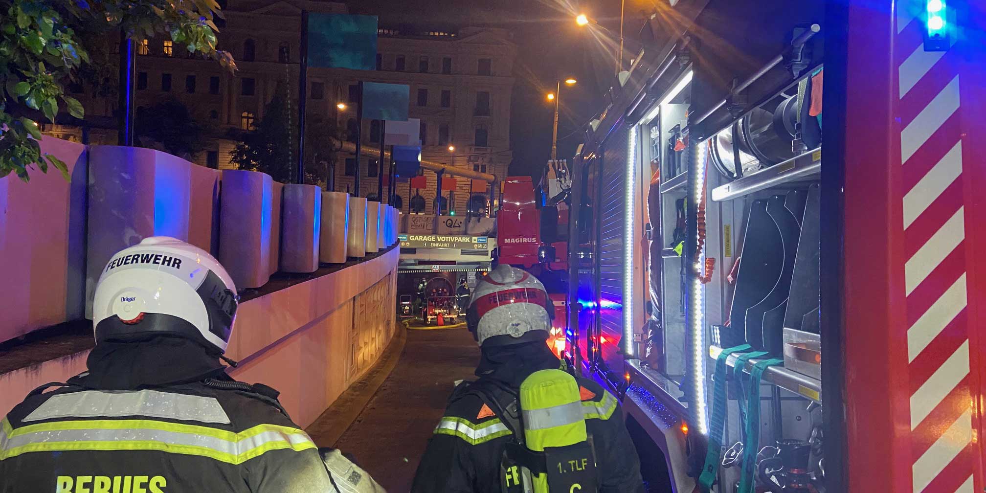 Die Einsatzkräfte waren gegen 21.30 Uhr alarmiert worden und aufgrund der Weitläufigkeit der Garage, die über mehrere Einfahrten bzw. Zugänge verfügt und sich über mehrere Ebenen erstreckt, mit einem Großaufgebot angerückt. Die Anlage wurde mit mehreren Großlüftern, die an den Einfahrten platziert wurden, vom Rauch befreit. Nach dem Brand aus stellte sich heraus, dass große Bereiche der Votivparkgarage von Rußablagerungen betroffen sind.