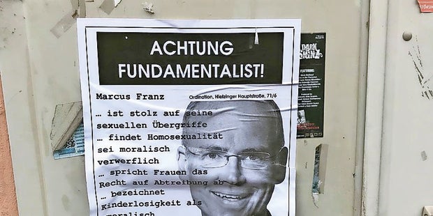 Wien. Seit mehreren Tagen schon werden in der Nähe der Ordination des Internisten und Ex-Abgeordneten des Teams Stronach Plakate aufgehängt, in denen er als rechtsextremer „Fundamentalist“ beschimpft und seine Einstellung gegenüber Frauen und Homosexualität angeprangert wird. Der Vater dreier Kinder setzt sich jetzt öffentlich zur Wehr und vermutet auf Twitter „linke Aktivisten“ hinter den Plakaten: „Bei solchen persönlichen und existenzbedrohenden Angriffen hört sich die Meinungsfreiheit auf.“ Er habe Anzeige erstattet und einen Anwalt eingeschaltet.