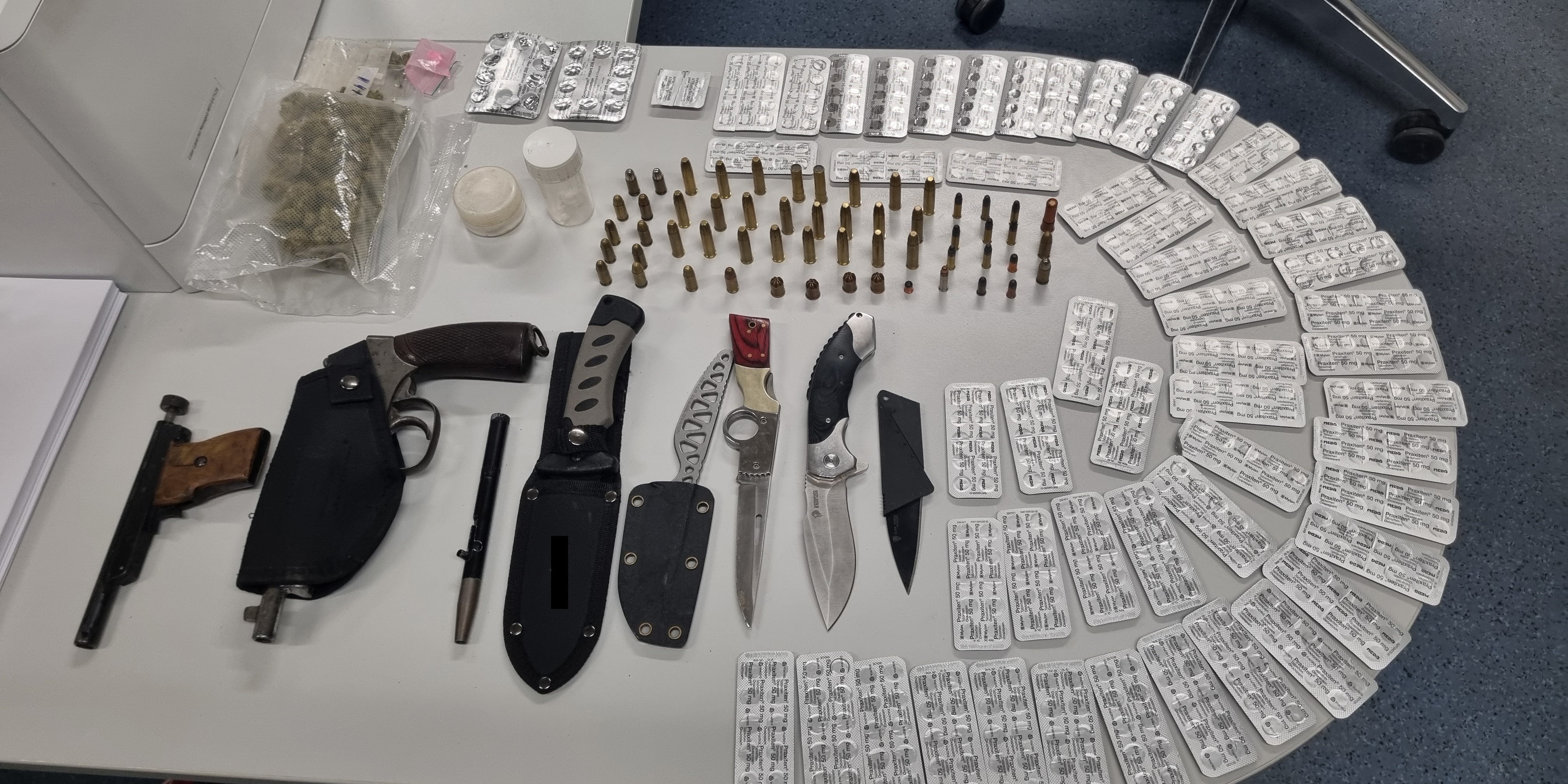 Wien. Die Polizei hat am Mittwochabend einen bewaffneten Alkoholisierten in militärischer Tarnkleidung mit einer Pistole und zwei Messern an seinem Gürtel in Wien-Margareten angehalten, nachdem er einen Supermarkt besucht hatte. Die Beamten durchsuchten ihn und stellten viele Waffen, Drogen und Bargeld sicher. Bei einer Hausdurchsuchung fanden sie Munition und Suchtmittel. Gegen den Mann bestand seit über 20 Jahren ein Waffenverbot, sagte ein Polizeisprecher am Freitag zur APA.