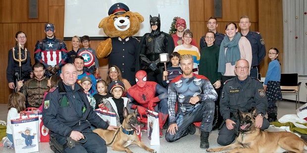 Beamte der Sondereinheit WEGA verkleideten sich als Superhelden und überreichten den Kindern Geschenke. Beamte der Diensthundeführerstaffel schauten mit ihren Vierbeinern vorbei und zeigten den Kids, was die Spürnasen alles draufhaben. Auch der ehemalige Profi-Fußballtormann Patrick Tischler kam zum Event und spielte mit den Kleinen eine Runde Fußball.(lae)