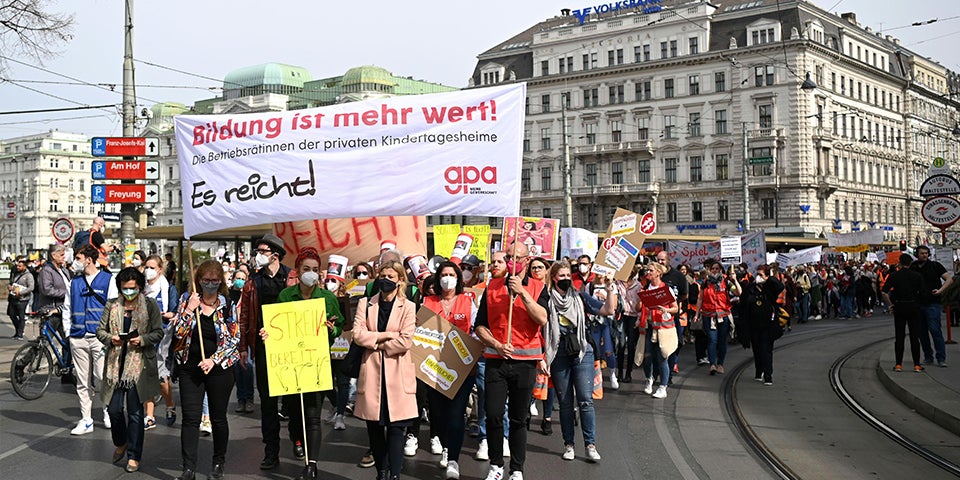 Am Dienstag ist in Wien erneut das Personal der privaten Wiener Kindergärten und Horte für bessere Arbeitsbedingungen auf die Straße gegangen, die schulischen Freizeitpädagogen waren diesmal ebenfalls dabei. Die Einrichtungen bleiben deshalb bis 15.30 Uhr geschlossen. Unter dem Motto "Es reicht!" war ein Demozug vom Votivpark zum Heldenplatz angekündigt. Die Forderungen: Mehr Ressourcen, mehr Personal, kleinere Gruppen, bessere Betreuungsverhältnisse und faire Bezahlung.