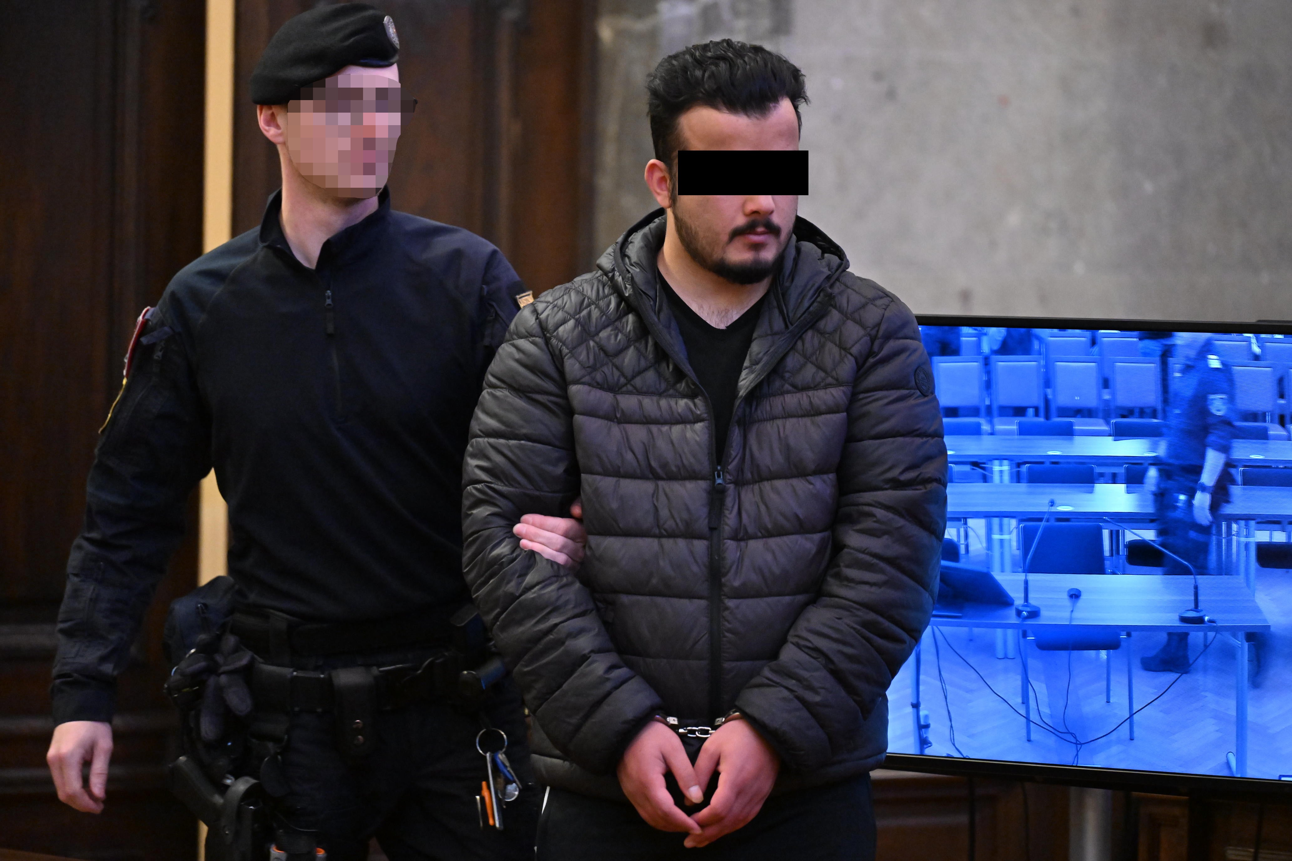 In Handschellen und unter Begleitung von zwei Justizwachebeamten wurde der Dreifach-Killer in den Großen Schwurgerichtssaal des Landesgerichts in Wien geführt. Der 27-jährige Ebadullah, der äußerst ruhig wirkte, weil er unter Medikamenten stehen soll, ist zur Verhandlung ganz in schwarz gekleidet.