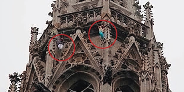 Nach dem ukrainischen Kletterer "Mustang Wanted" hat offenbar wieder jemand den 150-Meter-Turm der Votivkirche erklommen. In der Halloween-Nacht hängten Unbekannte zwei Puppen am Südturm der Ringstraßen-Kirche auf. "Es wird wohl ein Streich gewesen sein - wir lassen die Figuren jetzt entfernen. Die haben da nichts zu suchen", sagt eine Sprecherin der Votiv-Pfarre.