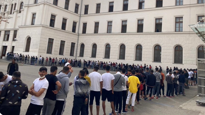 Rund 60.000 Asylanträge wurden heuer bereits in Österreich gestellt – und der Ansturm bricht nicht ab. Ein aktuell aufgenommenes Fotos (13.9.) zeigt die aktuelle Lage im Erstaufnahmezentrum Traiskirchen: Dort bilden sich meterlange Warteschlangen vor der Essensausgabe. Aufgrund der hohen Auslastung muss die Ausgabe in Tranchen abgehalten werden.