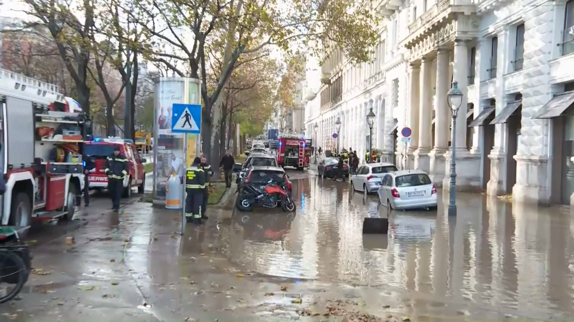 Nach einem Wasserrohrbruch an der Kreuzung Franz-Josefs-Kai und Schottenring stehen Teile des Rings unter Wasser.