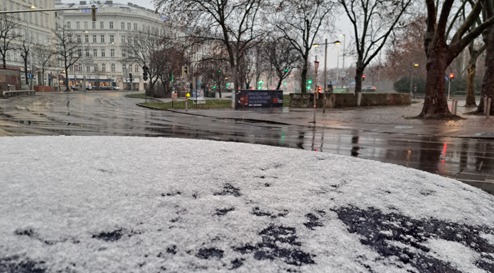 In der Nacht setzte bereits Schneeregen in Wien ein, gegen halb 6 Uhr früh wurde es sogar ein kurzes Schneegestöber. Dafür, dass der Schnee richtig liegen bleibt, ist es mit knapp 2 Grad ein wenig zu warm.