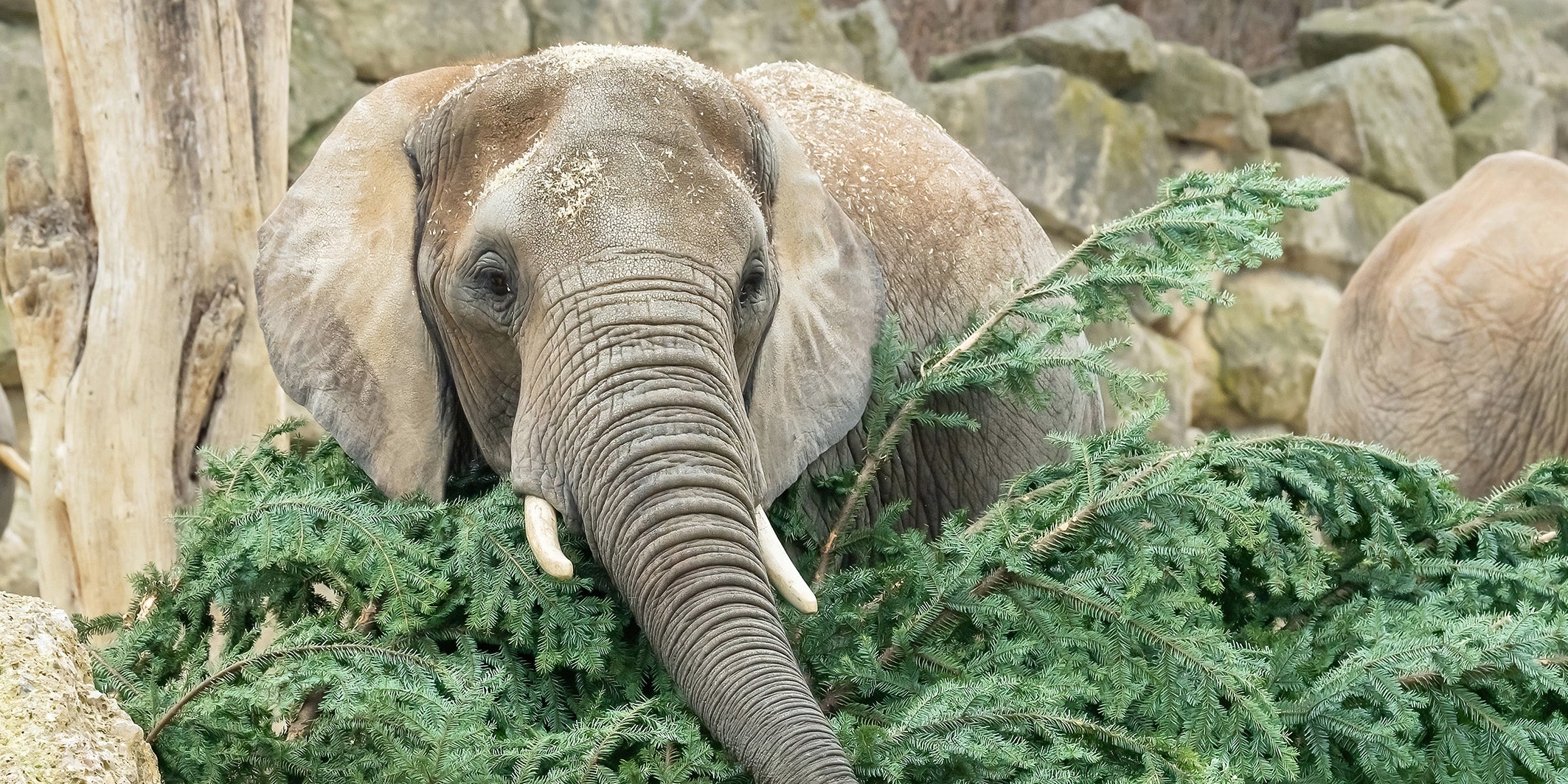 Elefantenkuh Numbi wagte sich als erste mutig an die duftende Tanne heran. Mit einem kleinen Ast flitzte sie zu Elefantenkuh Tonga und ihren Töchtern Mongu und Iqhwa zurück. Elefantenbulle Tembo stürzte sich dann kurz darauf in das holzige Abenteuer. Gemeinsam knabberten und zupften sie alle neugierig an Nadeln und Ästen und zogen das stachelige Gehölz durch die Anlage. „Der unbehandelte Baum dient den Elefanten vor allem als kreative Beschäftigung. Sie schaben die Rinde herunter und nutzen ihn beispielsweise auch als Kratzbaum. Eine willkommene Abwechslung für unsere Elefantenherde“, so Tiergartendirektor Stephan Hering-Hagenbeck.