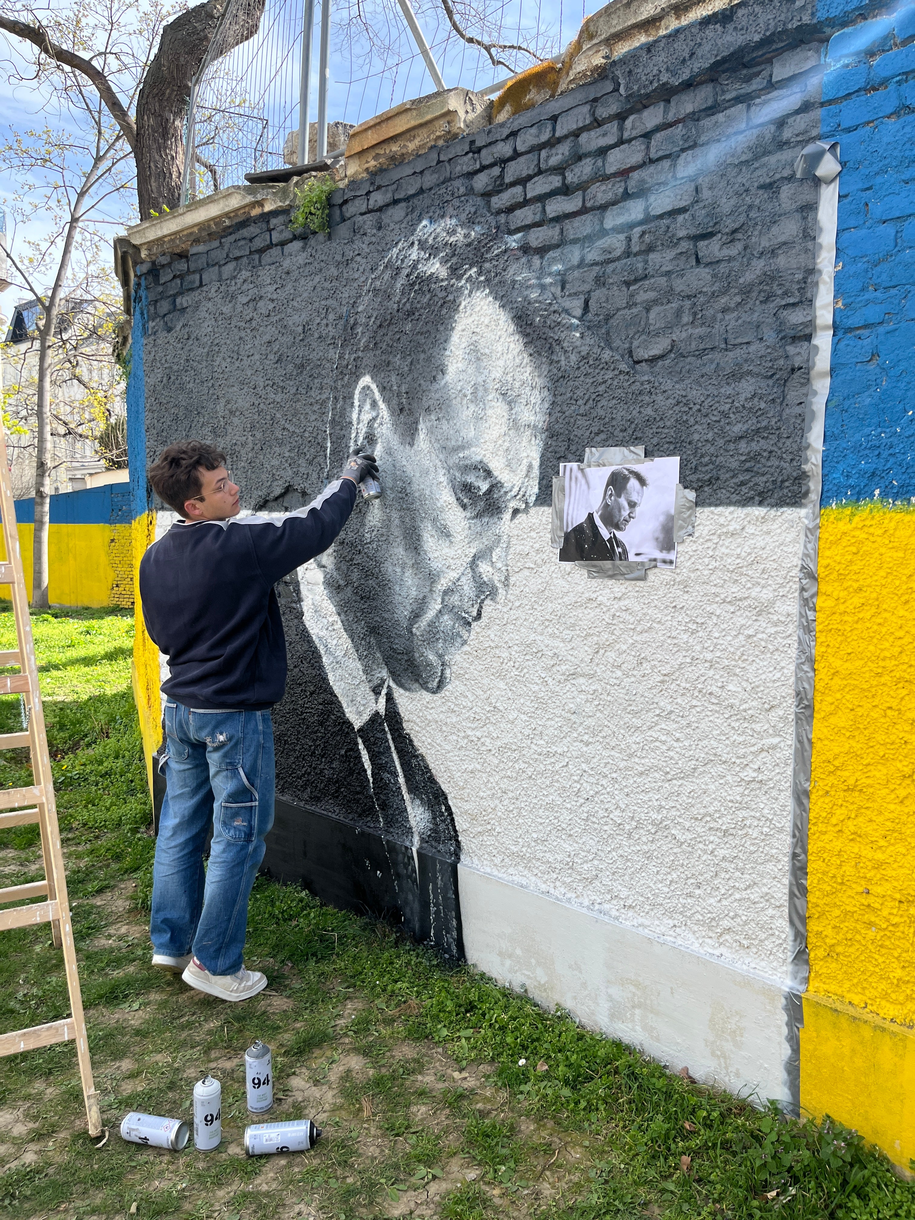 Zwei Künstler sprühten Auftragsgraffitis auf die blau-gelbe Mauer hinter dem Russendenkmal.