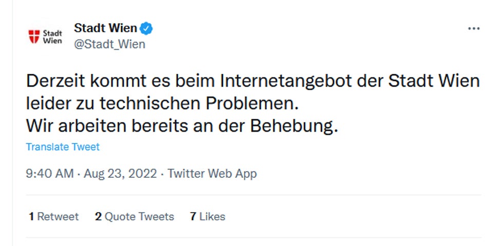 Nach den kurzzeitigen IT-Problemen auf den Online-Kanälen der Stadt Wien Anfang Juli ist die Webseite der Stadt am Dienstagmorgen erneut temporär nicht erreichbar gewesen. Gegen 10.30 Uhr schienen die aufgetretenen Störungen auf der zentralen Plattform der städtischen Ämter (www.wien.gv.at) behoben zu sein. Laut Angaben der zuständigen IT-Abteilung gegenüber der APA habe es sich um ein "ganz normales technisches Gebrechen" gehandelt.