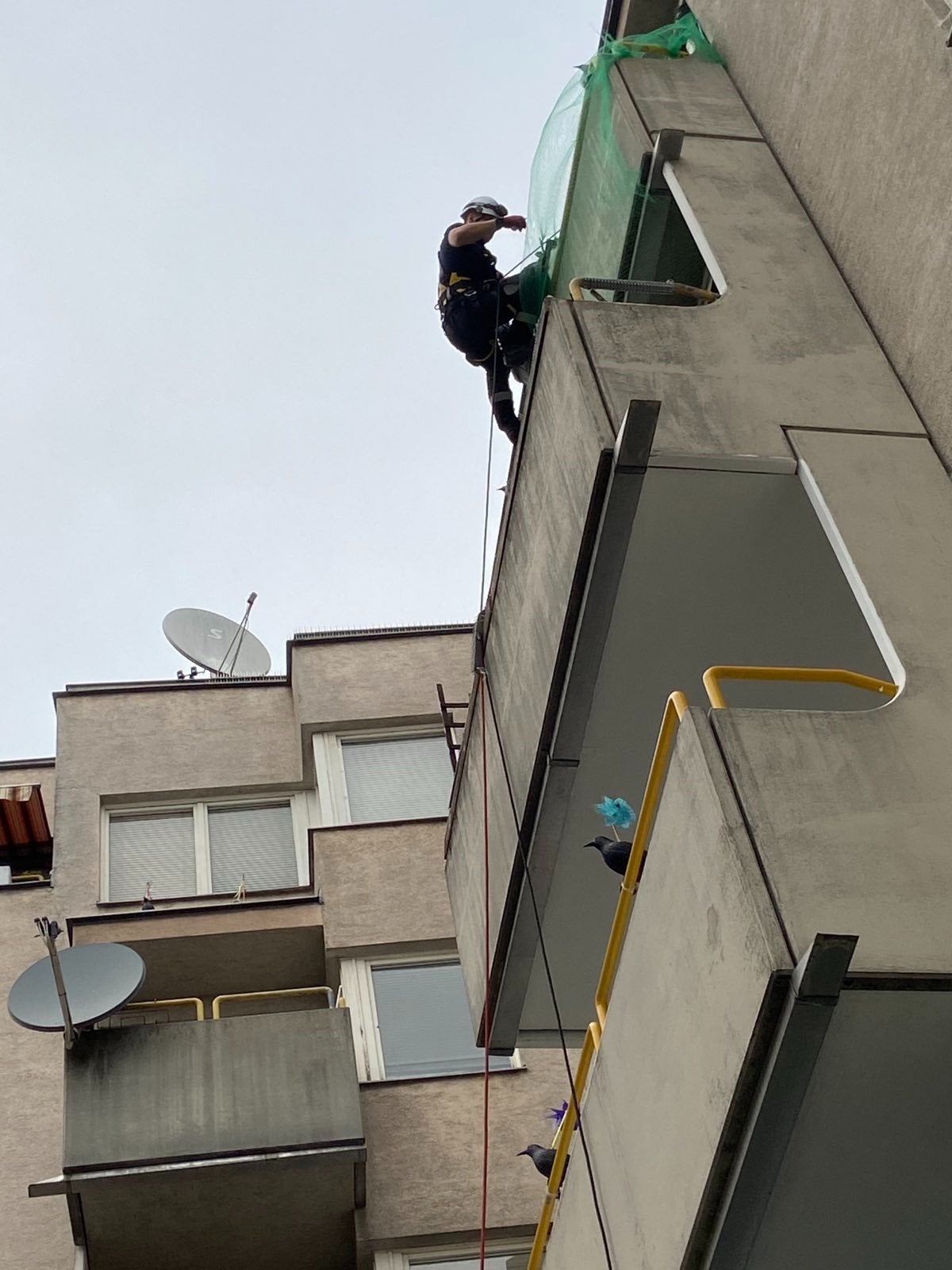 Ein aufmerksamer Nachbar sah den im Netz zappelnden Vogel und verständigte Sonntag am späten Nachmittag die Berufsfeuerwehr. Ein Höhenretter musste sich sodann vom Dach zu dem Balkon abseilen, da in keiner der Wohnungen auf der gesamten Etage jemand zu Hause war.