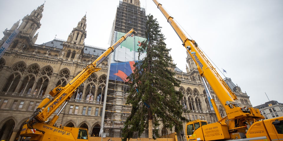 Morgen, Mittwochfrüh, steht schon das nächste Christbaum-Aufstellen auf dem Programm - dieses Mal beim Schloss Schönbrunn. Die 90 Jahre alte Fichte aus dem Wienerwald wird während der Vorweihnachtszeit den Ehrenhof zieren, in dem auch der traditionelle Weihnachtsmarkt stattfindet. Der 18 Meter hohe Koloss soll ab 23. November im Lichterglanz erstrahlen - und damit etwas später als der hölzerne Kollege am Rathausplatz.
