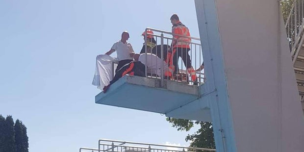 Der Bub war vom 10-Meter-Turm gefallen und schlug am 5-Meter-Brett auf.
