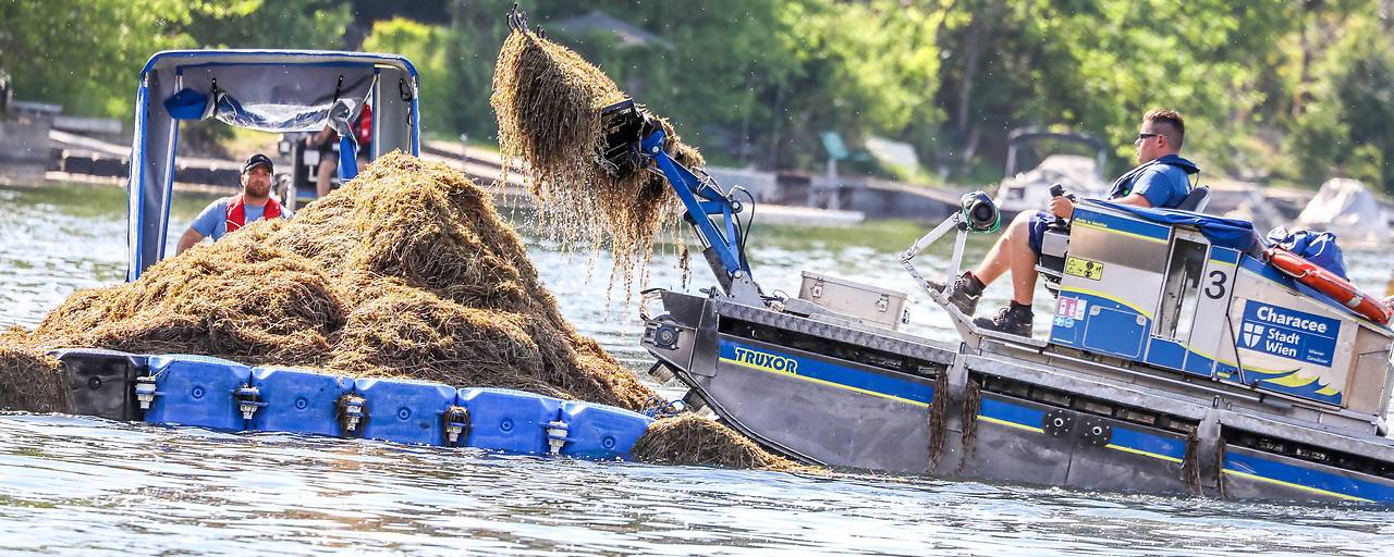 Ab Montag sind die Mähboote wieder auf der Alten Donau im Bereich Kaiserwasser aktiv. Die Flotte umfasst 15 Amphibienmähboote, die bis zu 2,5 Meter tief mähen und elf Hektar Wasserfläche pro Tag schaffen. Das Schnittgut landet im Kompostwerk Lobau und wird zu Bioerde.