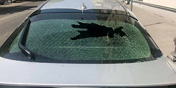 Fall 2: „Stopp Uber“. Die hintere Scheibe eines Uber-Autos wird eingeschlagen. Der Täter schreibt „Stopp Uber“ neben das Loch.