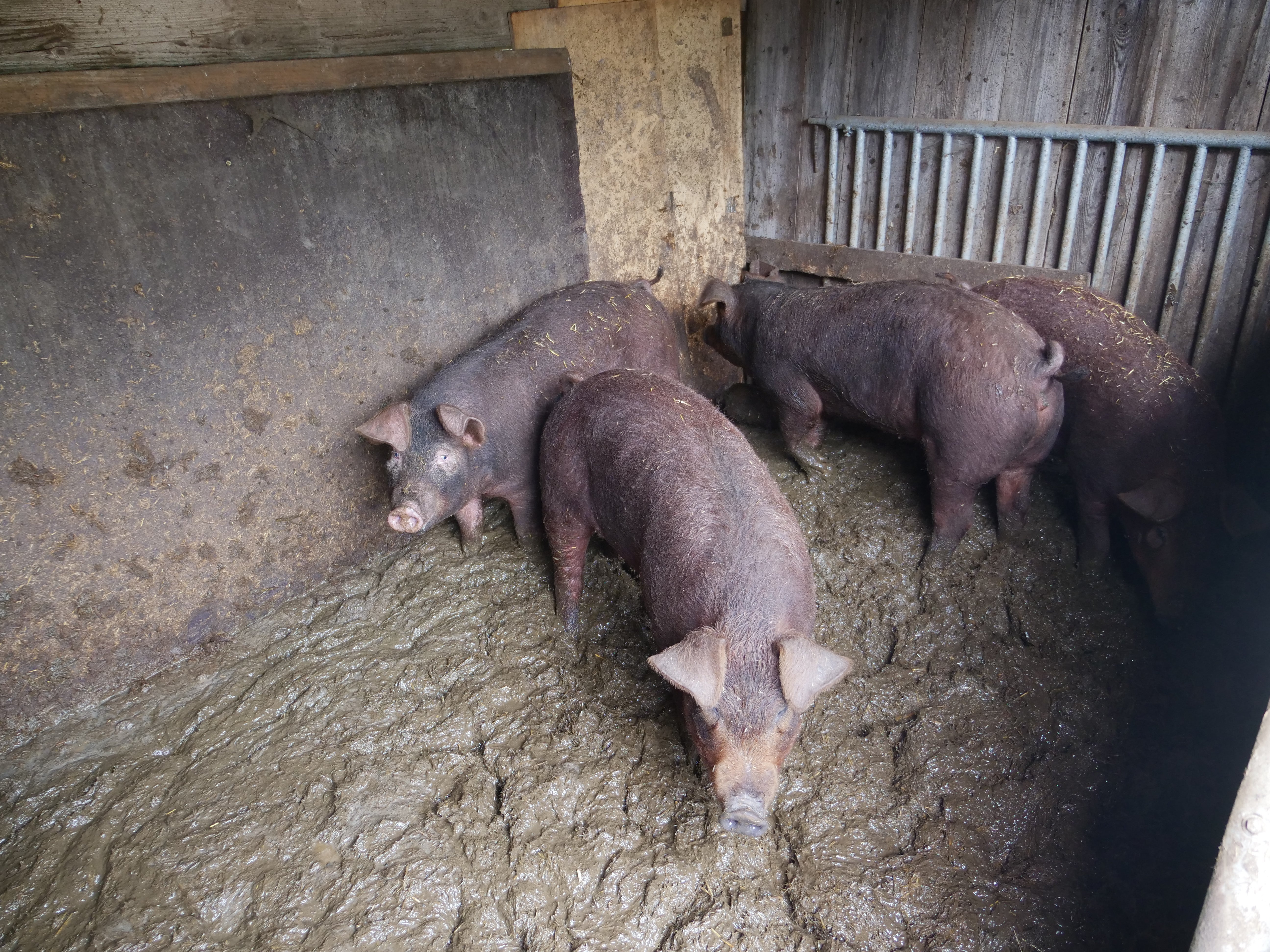 Die Schweine leiden unter dem Fehlen einer trockenen Liegefläche, was eigentlich gesetzlich vorgeschrieben ist. Als Unterschlupf dient ihnen ein Blechtunnel, in dem es bei starkem Sonnenschein unangenehm heiß wird. Darüber hinaus fehlt den über 30 Schweinen, sowohl den Kleinen als auch den Größeren, unzulässigerweise Beschäftigungsmaterial.