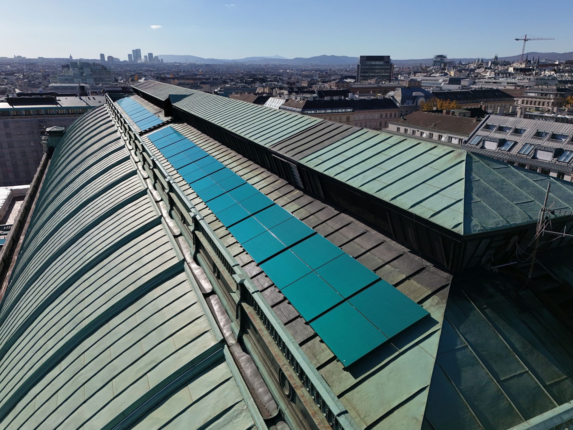 Sichtbar sind die Photovoltaik-Module ausschließlich aus der Vogelperspektive, Stadtbild und Denkmalschutz bleiben somit erhalten. "Denkmalgeschützte Häuser sind immer eine besondere Herausforderung, das kennen wir von unserer PV-Anlage am Rathaus", so Stadträtin Ulli Sima (SPÖ) am Donnerstag. Verwendet wurden grüne Glas-Folien-Module, die sich farblich an das historische Kupferdach anpassen. Ihre Leichtbauweise schont die Statik des denkmalgeschützten Gebäudes. Auch bestehende Betriebsräume und Leitungswege wurden geschickt genutzt, um Eingriffe in die Substanz zu vermeiden. "Mitten in der Stadt und auf bestehenden Gebäuden ist beim Ausbau der Sonnenstromerzeugung Kreativität und Maßarbeit gefragt", betont Wien-Energie-Chef Michael Strebl.