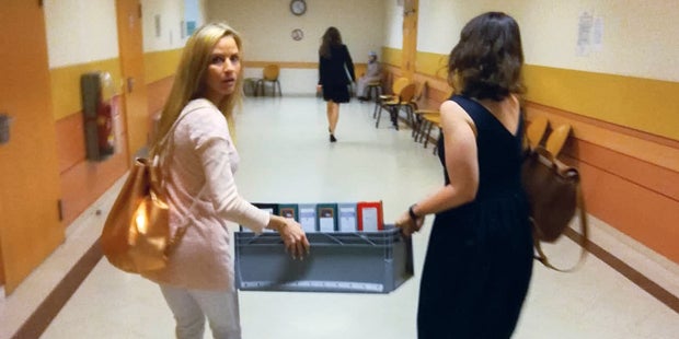 Eine Kiste mit sieben Ordnern trägt ATV-Starlet (Nacktes Österreich) und Fotomodell Wendy Night am Montag in den Saal 203 des Landesgerichts für Strafsachen Wien. Ihre Prozessbegleitung hilft beim Tragen.